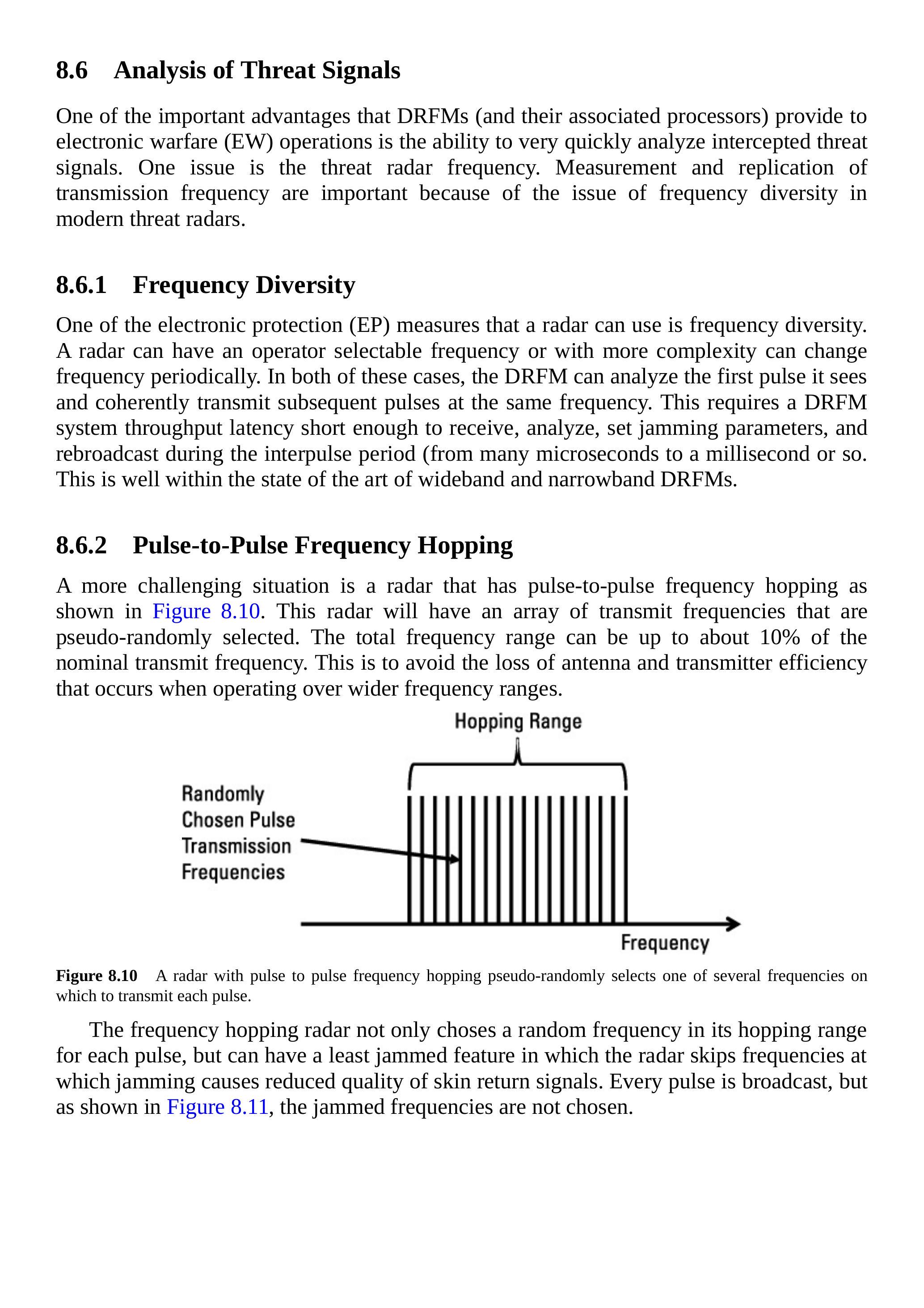 频率跳变雷达不仅为每个脉冲选择跳变范围内的随机频率,还可以具有“最少干扰频率”功能,即雷达会跳过在这些频率下干扰导致皮肤回波质量下降的频率。每个脉冲都会被发射,但如图 8.11 所示,受干扰的频率不会被选择。