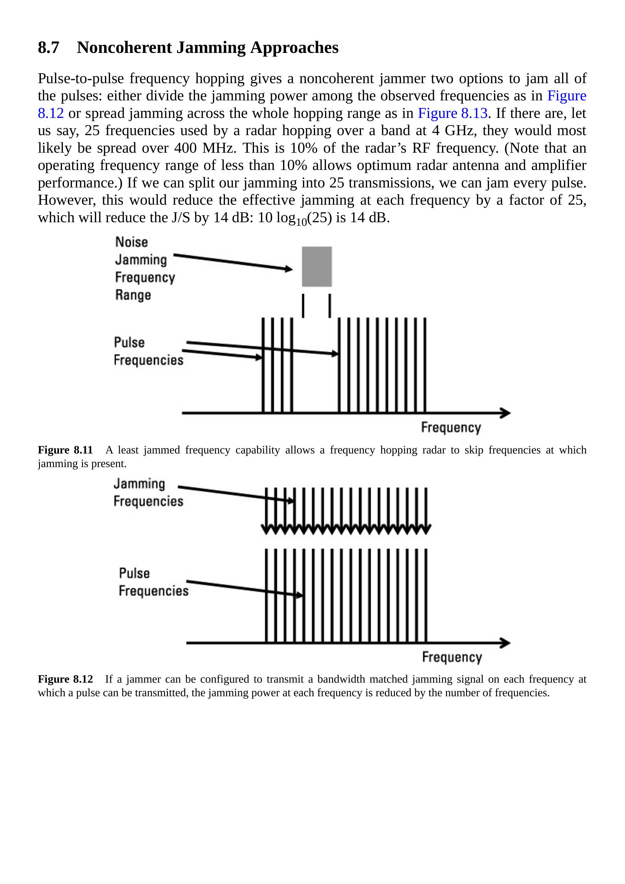 脉冲间频率跳变为非相干干扰器提供了两种干扰所有脉冲的选择:要么像图 8.12 所示将干扰功率在观测到的各频率间分配,要么像图 8.13 所示将干扰功率扩展到整个跳变范围。如果一个雷达在 4 GHz 频段内跳变使用 25 个频率,这些频率很可能分布在 400 MHz 范围内。这是雷达射频的 \(10\%\)(注意,操作频率范围小于 \(10\%\) 可获得最佳雷达天线和放大器性能)。如果我们可以将干扰分成 25 次发射,就可以干扰每个脉冲。然而,这将使每个频率的有效干扰降低 25 倍,从而使 J/S 降低 \(14 \mathrm{~dB}\):\(10 \log _{10}(25)\) 为 14 dB。