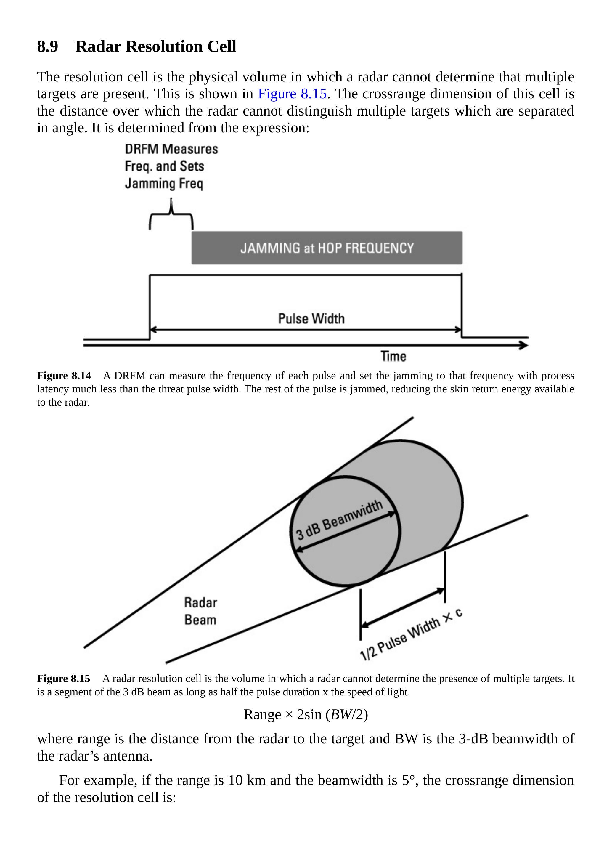分辨单元是雷达无法判定存在多个目标的物理体积,如图 8.15 所示。该单元的横向维度是雷达无法区分角度上分离的多个目标的距离,由下式确定: