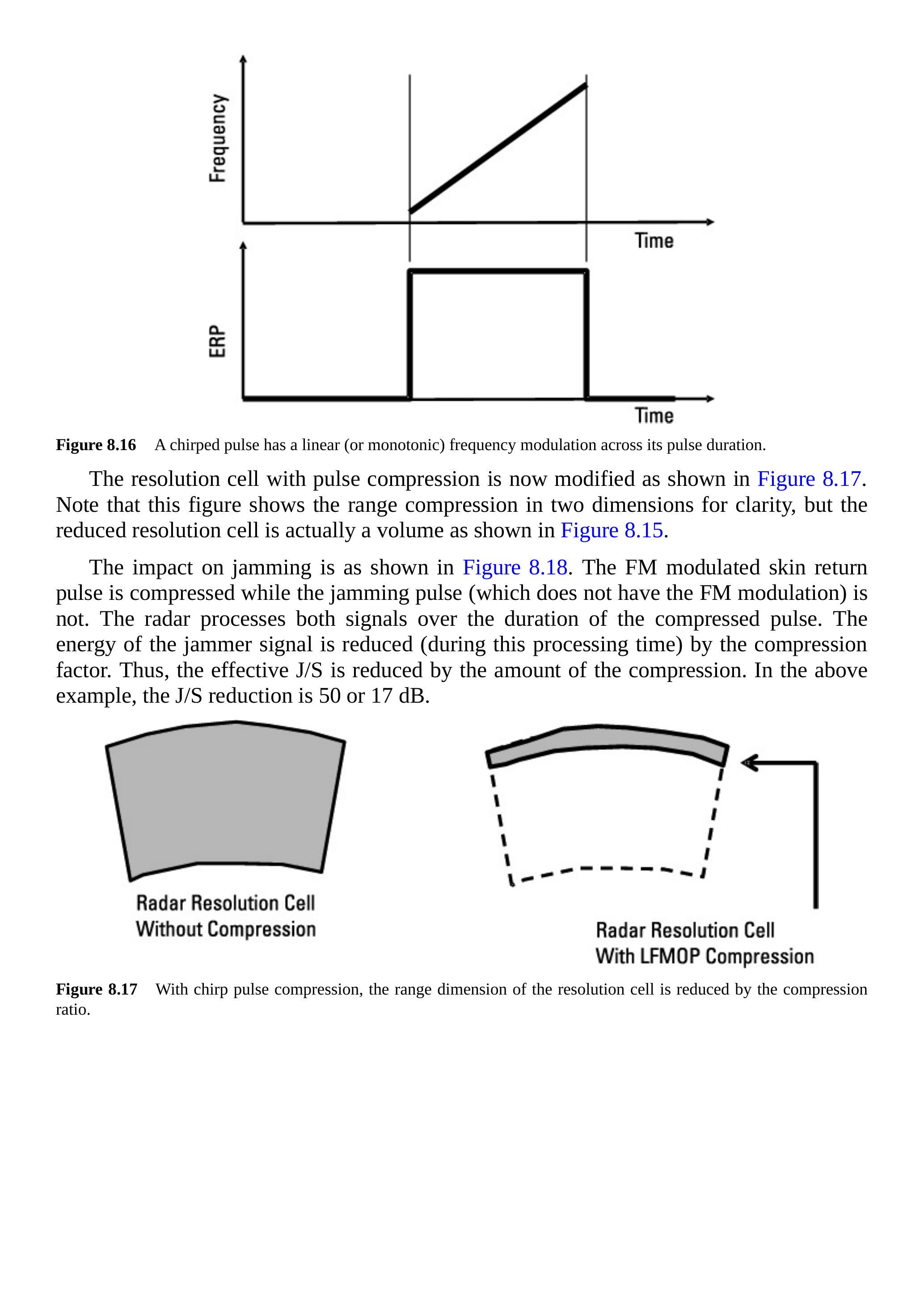 干扰的影响如图 8.18 所示。FM 调制的皮肤回波脉冲被压缩,而干扰脉冲(没有 FM 调制)则不被压缩。雷达在压缩脉冲的持续时间内处理两个信号。干扰信号的能量在处理期间按压缩比减少。因此,有效 J/S 会降低相应的压缩量。在上述例子中,J/S 降低为 50 倍,即 17 dB。