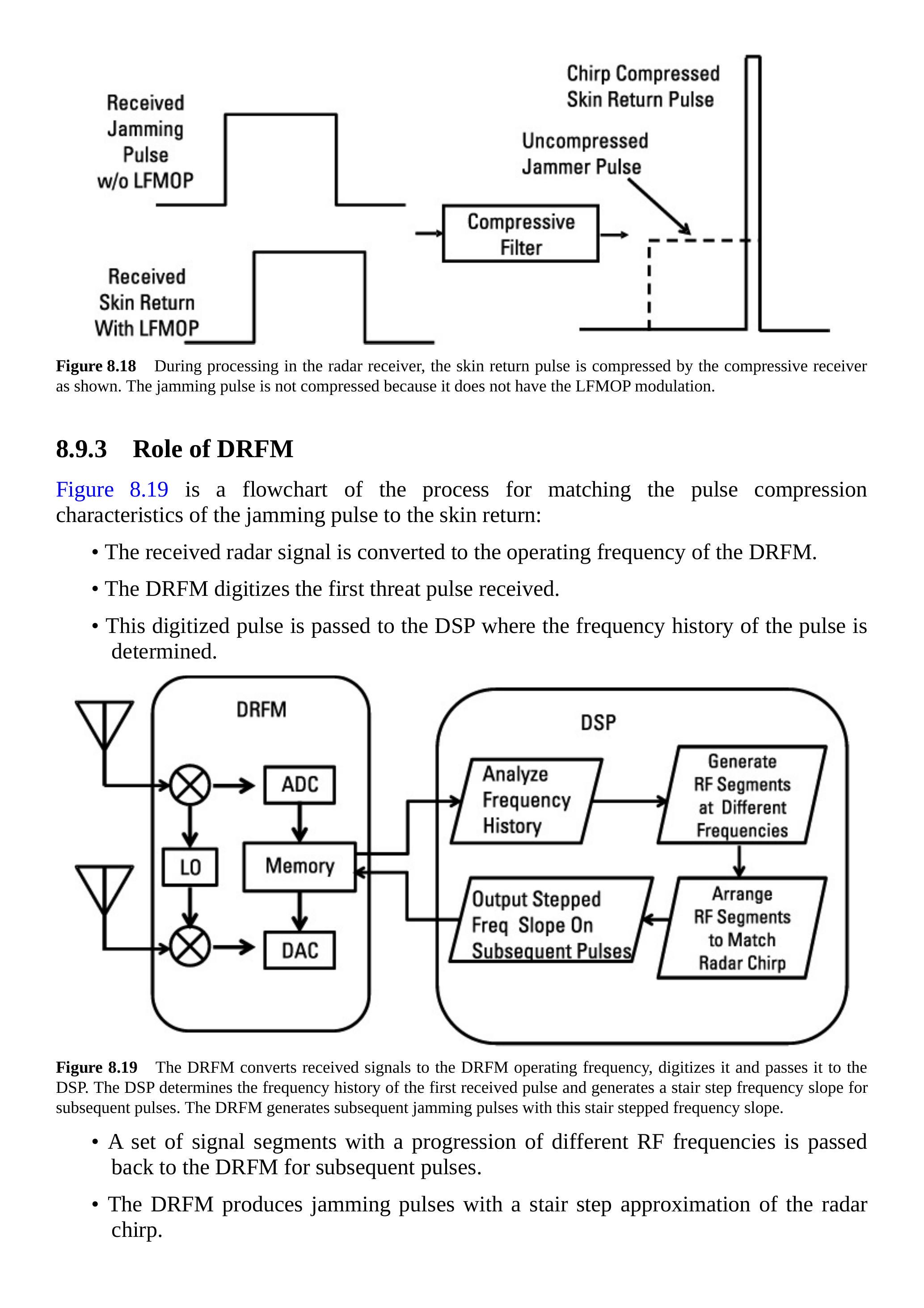图 8.19 DRFM 将接收信号转换到 DRFM 工作频率,进行数字化并传递给 DSP。DSP 确定首个接收脉冲的频率历史,并为后续脉冲生成阶梯状频率斜率。DRFM 生成后续干扰脉冲,具有该阶梯频率斜率。