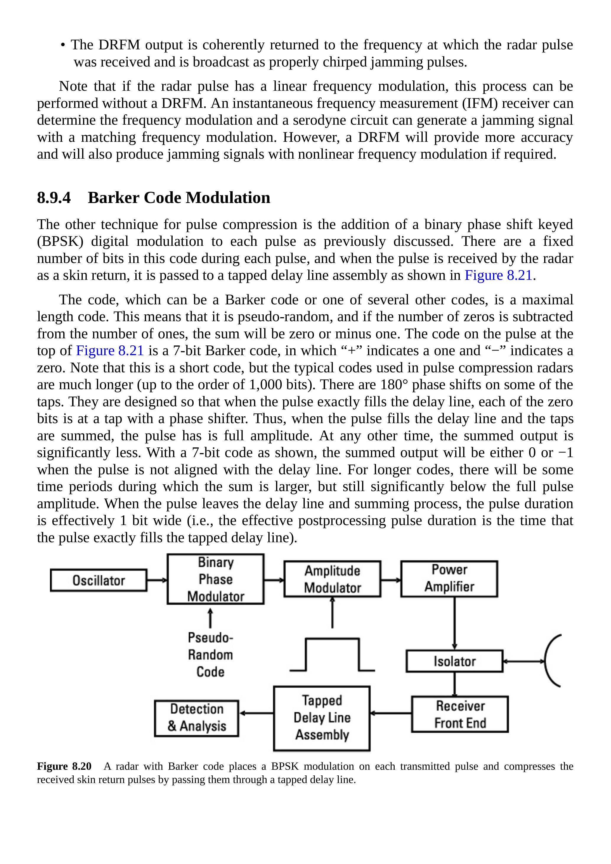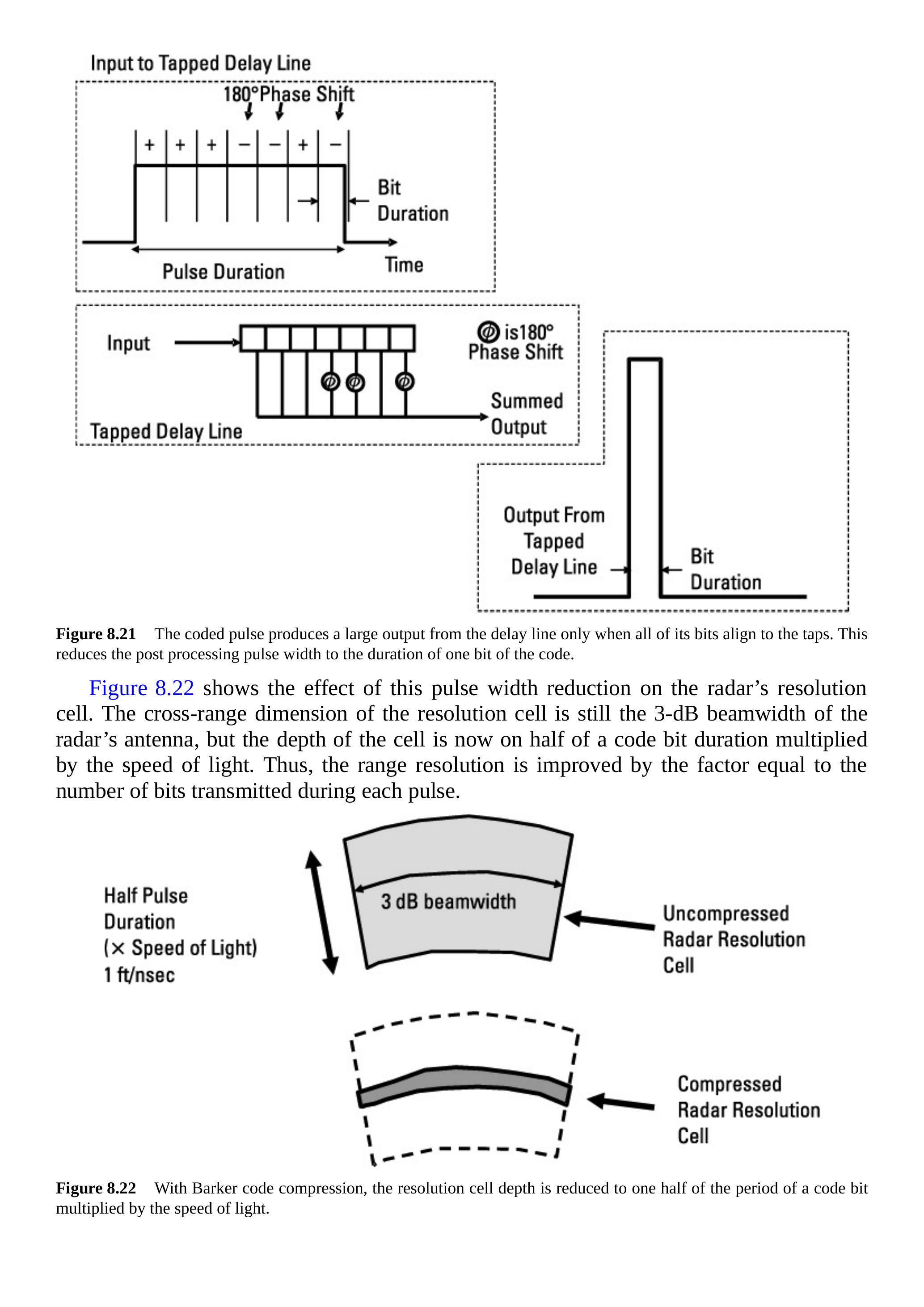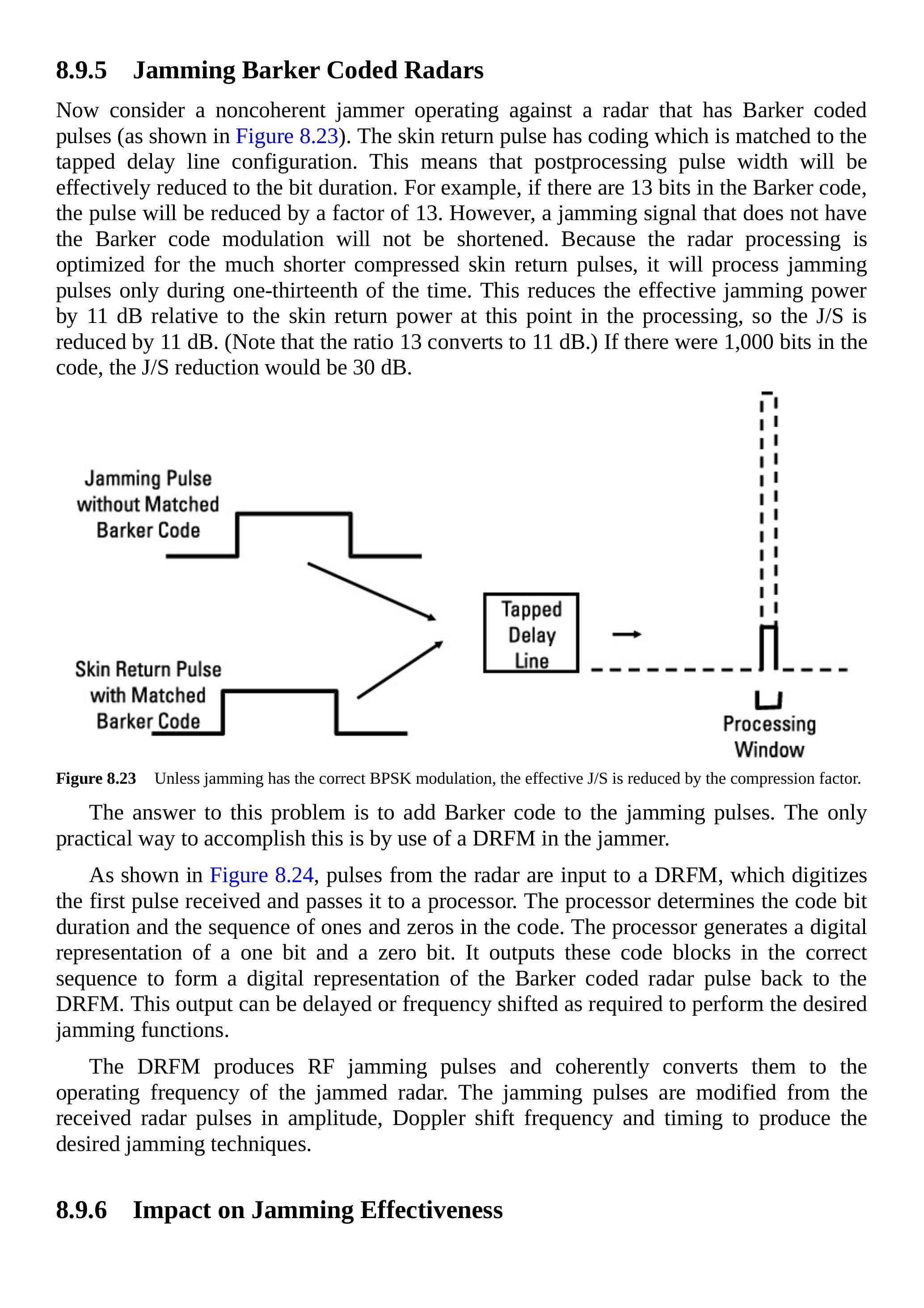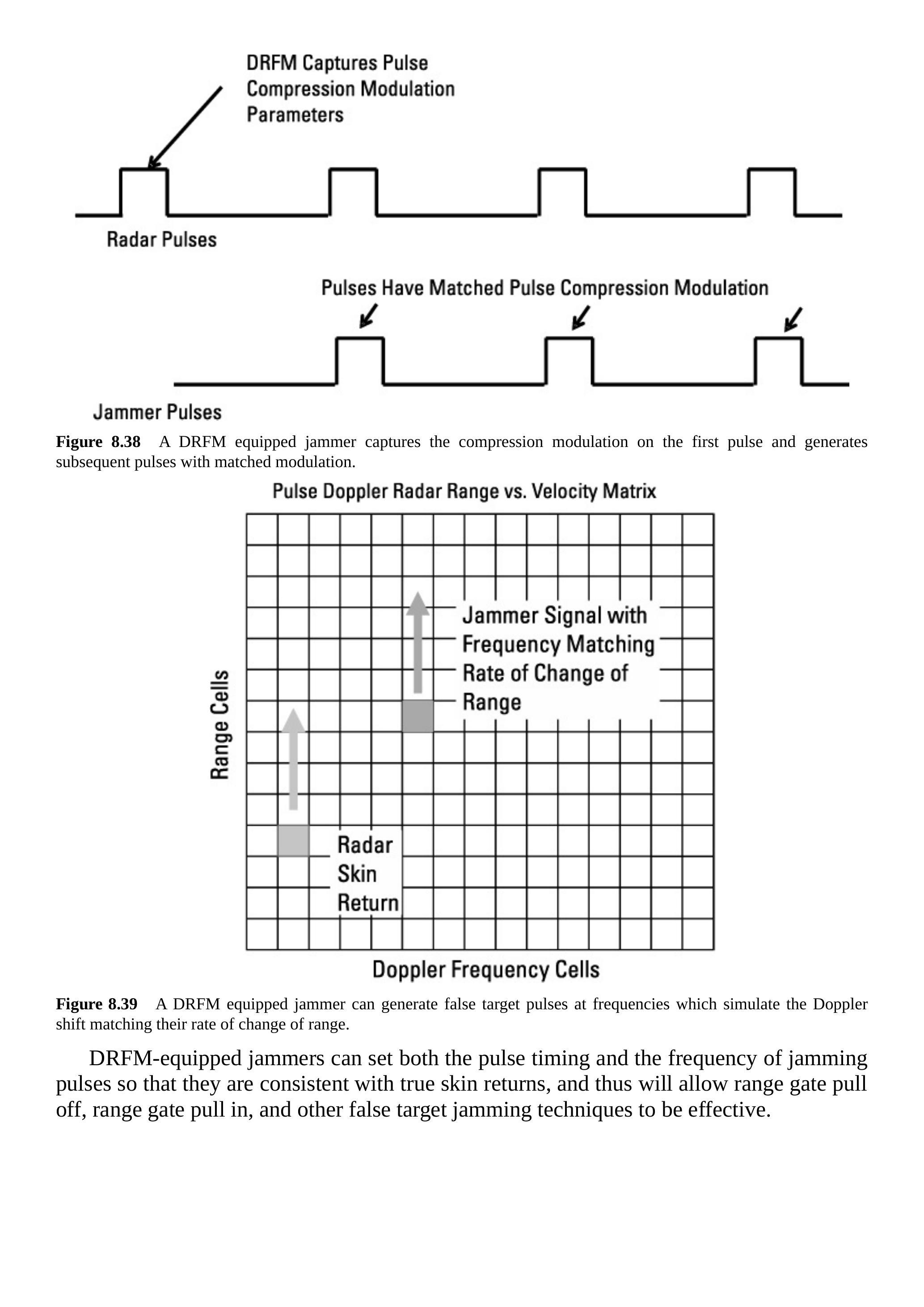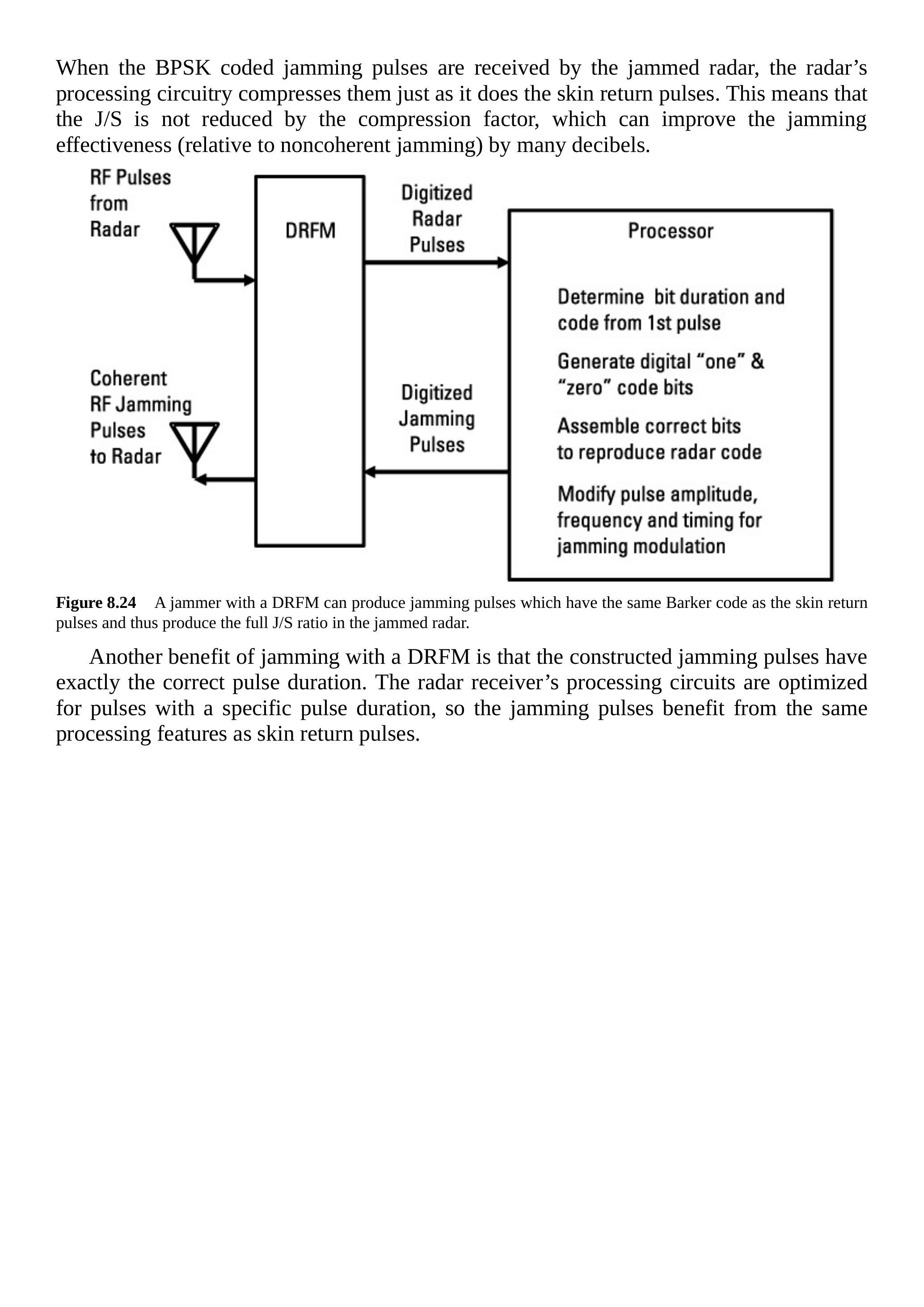 配备 DRFM 的干扰器可以确定接收到的第一个 Barker 码脉冲的比特率和精确数字码。然后,它可以为所有后续的目标回波脉冲生成具有正确 Barker 码的干扰脉冲,如图 8.38 所示。