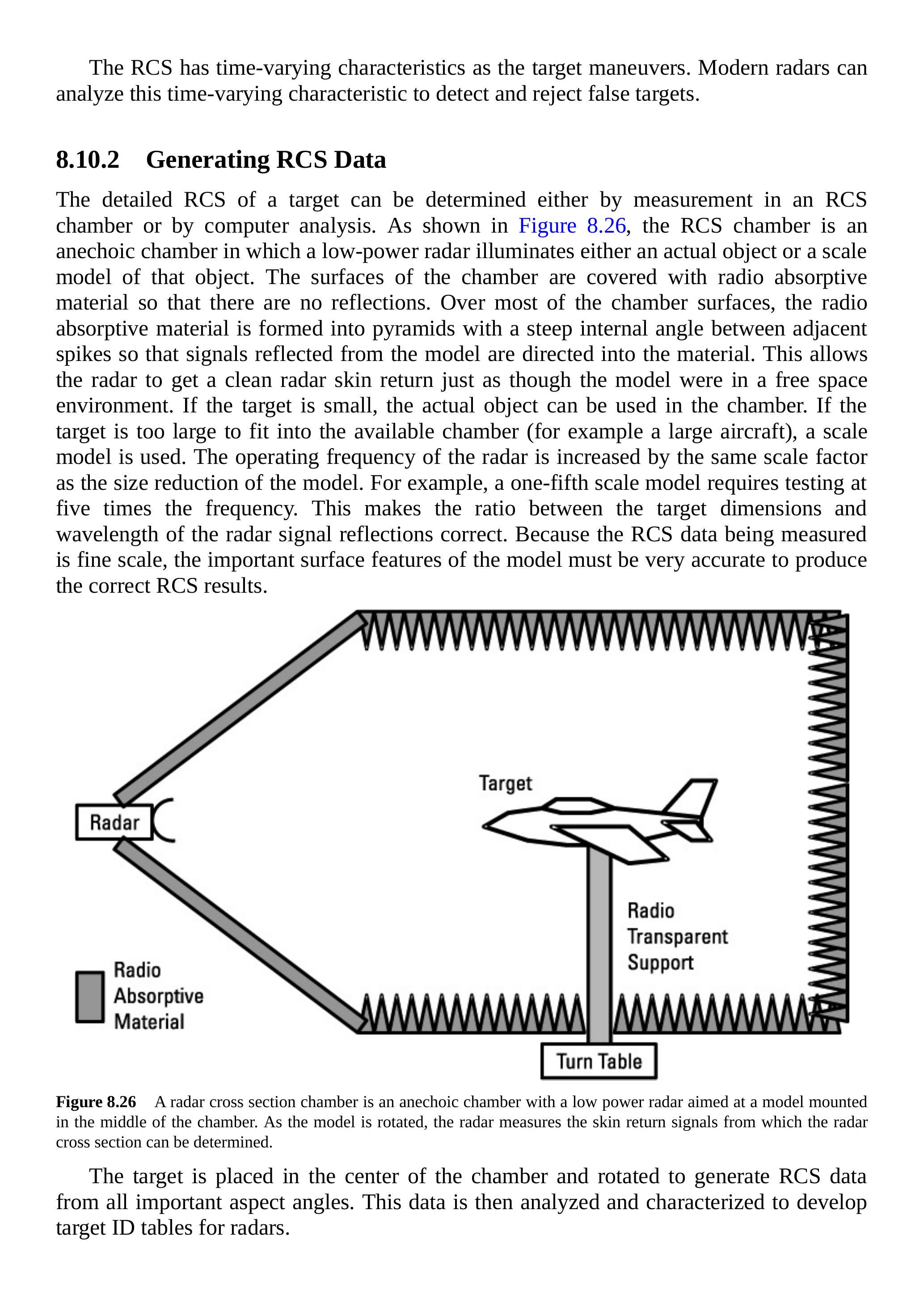 目标的详细雷达散射截面(RCS)可以通过在 RCS 室中测量或通过计算机分析来确定。如图 8.26 所示,RCS 室是一个电波消声室,其中低功率雷达照射实际物体或其缩尺模型。消声室的表面覆盖了吸收电磁波的材料,以消除反射。在消声室的大部分表面上,吸收材料被制成金字塔形,邻近尖端之间有陡峭的内部角度,从而将从模型反射的信号导入材料中。这使雷达能够获得干净的雷达皮肤回波,就好像模型处于自由空间环境中一样。如果目标较小,可以直接在室内使用实际物体。如果目标过大而无法放入现有的消声室(例如大型飞机),则使用缩尺模型。雷达的工作频率按模型尺寸缩小的比例增加。例如,一台五分之一缩尺模型需要在五倍频率下进行测试。这使得目标尺寸与雷达信号波长的比率正确。由于测量的 RCS 数据是精细尺度的,因此模型的重要表面特征必须非常准确,以产生正确的 RCS 结果。