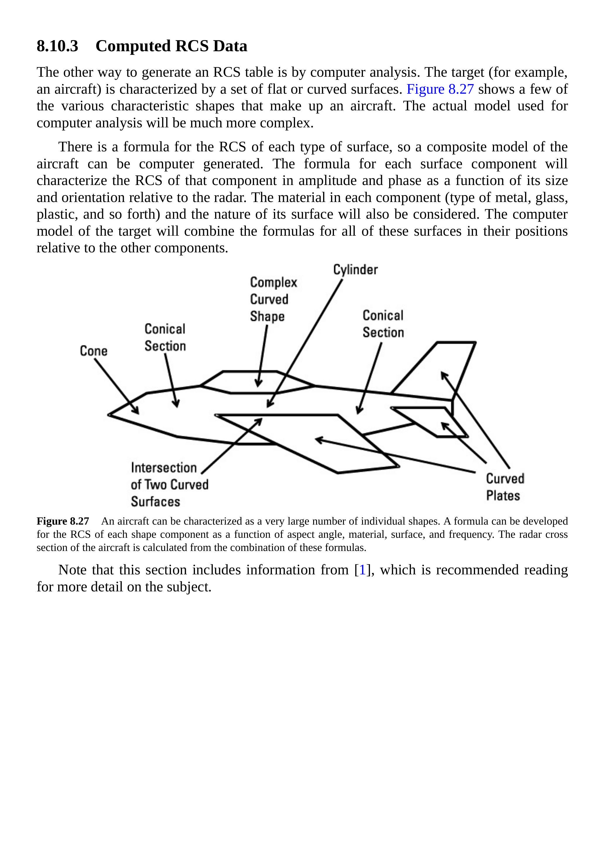 生成 RCS 表的另一种方法是通过计算机分析。目标(例如飞机)可以用一组平面或曲面来表征。图 8.27 显示了构成飞机的一些典型形状。用于计算机分析的实际模型会更为复杂。