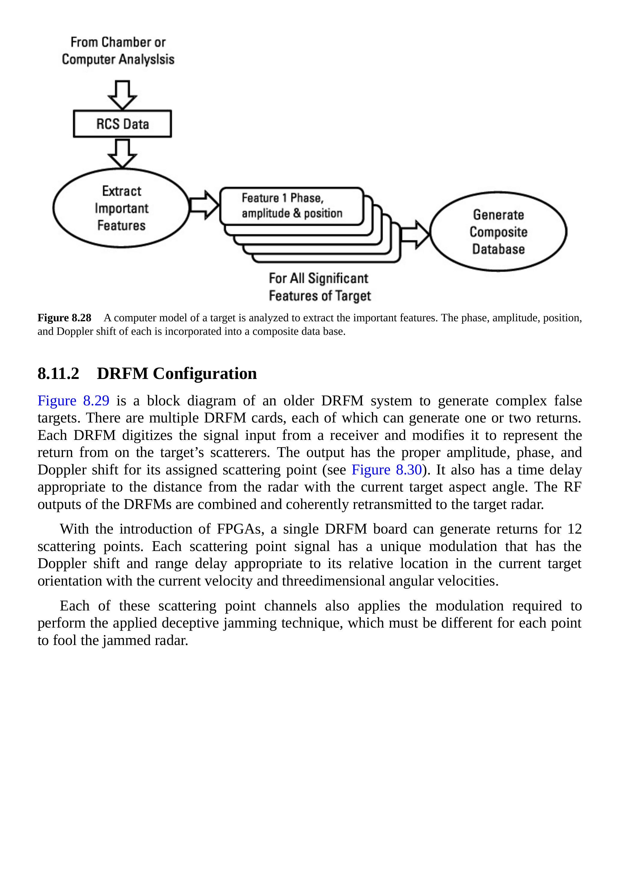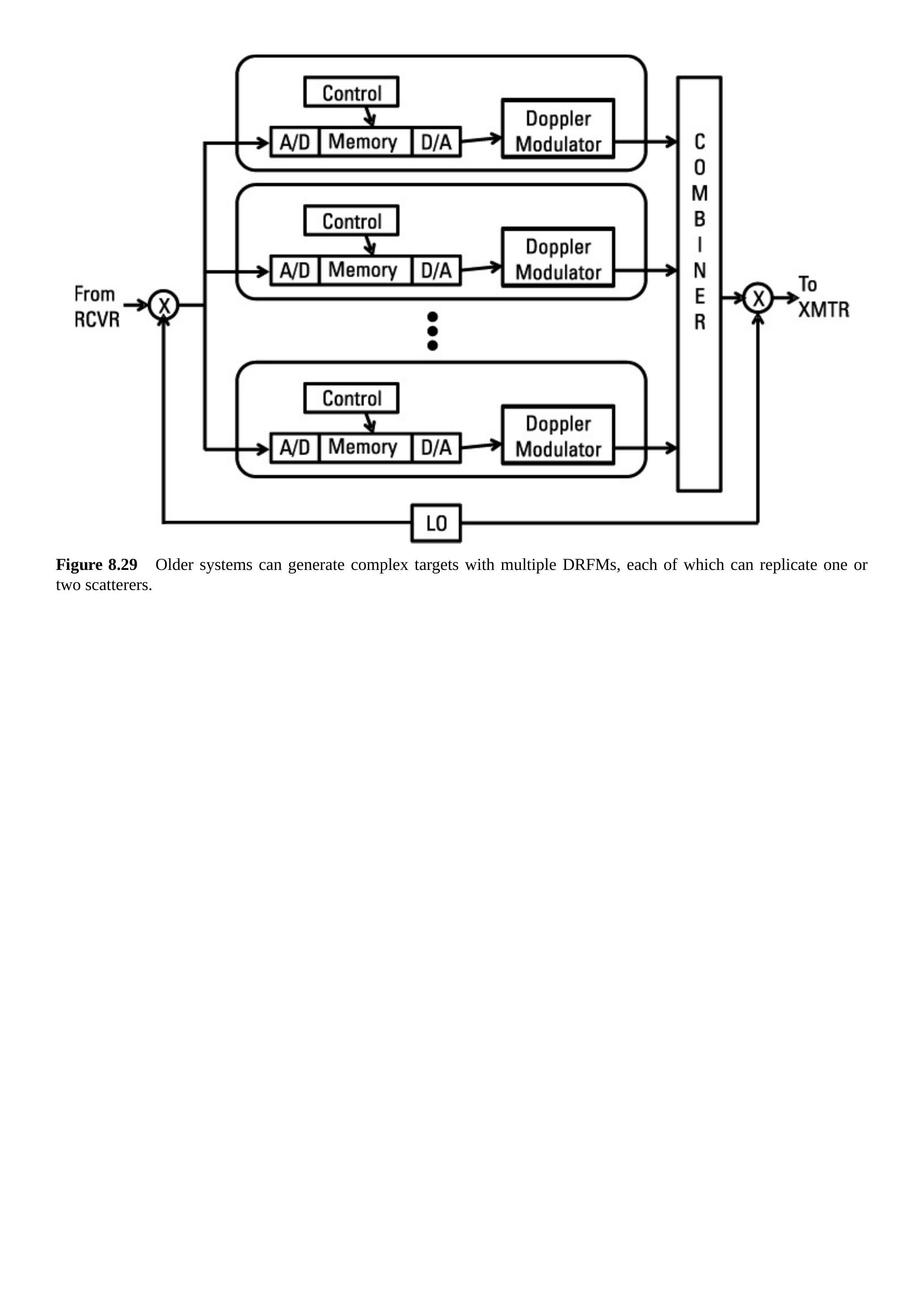 图 8.29 是一个较早的 DRFM 系统生成复杂虚假目标的框图。系统中有多个 DRFM 卡,每个卡可以生成一个或两个回波。每个 DRFM 对接收到的信号进行数字化,并将其修改为表示来自目标散射点的回波。输出具有分配给其散射点的适当幅度、相位和多普勒频移(见图 8.30)。它还具有与当前目标方位角下雷达距离相对应的时间延迟。DRFM 的射频输出被组合并相干地重新发射到目标雷达。