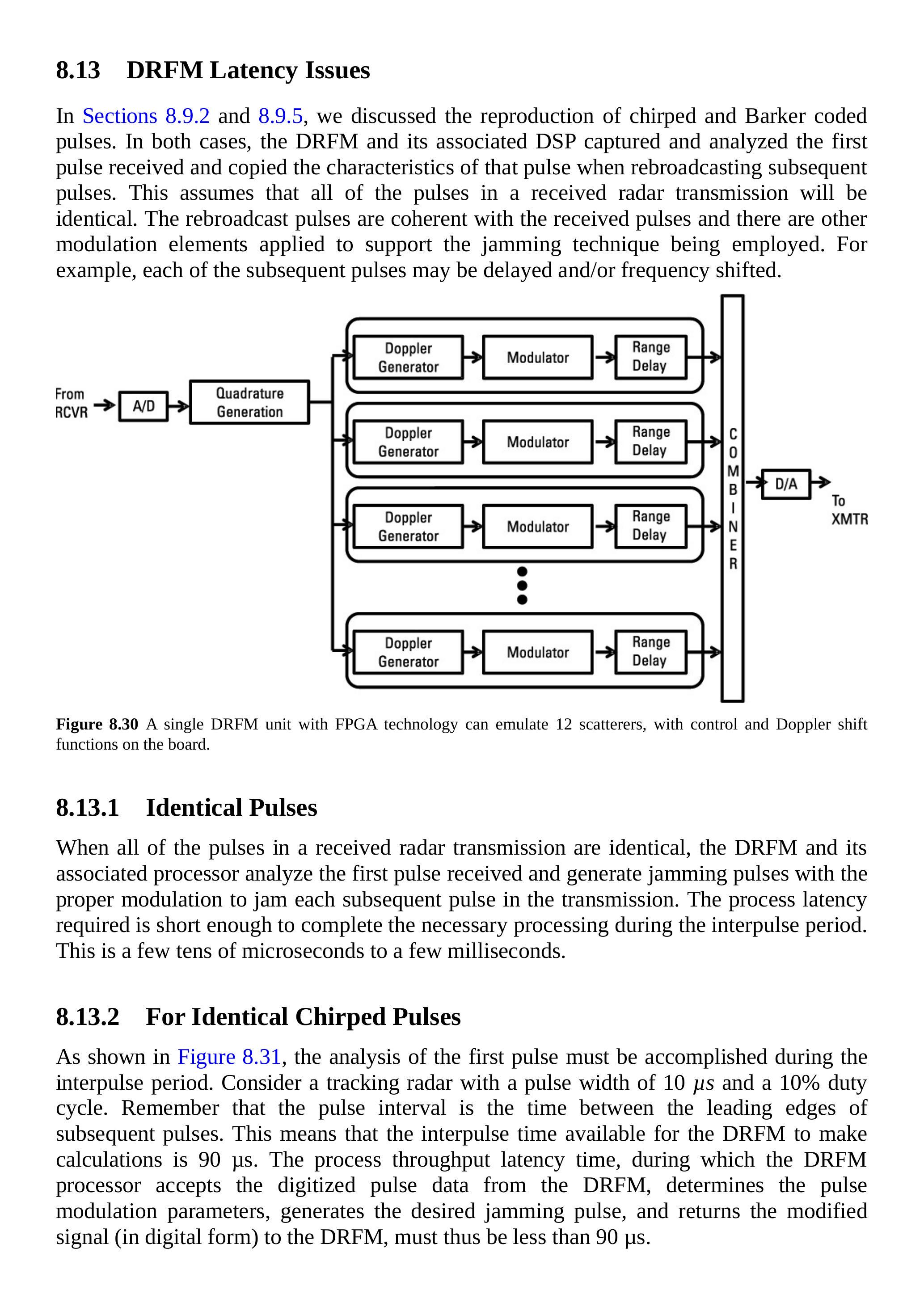 如图 8.31 所示,第一枚脉冲的分析必须在脉冲间隔期间完成。考虑一个脉冲宽度为 \(10 \mu \mathrm{~s}\) 且占空比为 10% 的跟踪雷达。请记住,脉冲间隔是后续脉冲的前沿之间的时间。这意味着 DRFM 可用于计算的脉冲间隔时间为 \(90 \mu \mathrm{~s}\)。处理吞吐延迟时间,即 DRFM 处理器接收来自 DRFM 的数字化脉冲数据、确定脉冲调制参数、生成所需干扰脉冲并将修改后的信号(数字形式)返回给 DRFM 的时间,必须小于 \(90 \mu \mathrm{~s}\)。