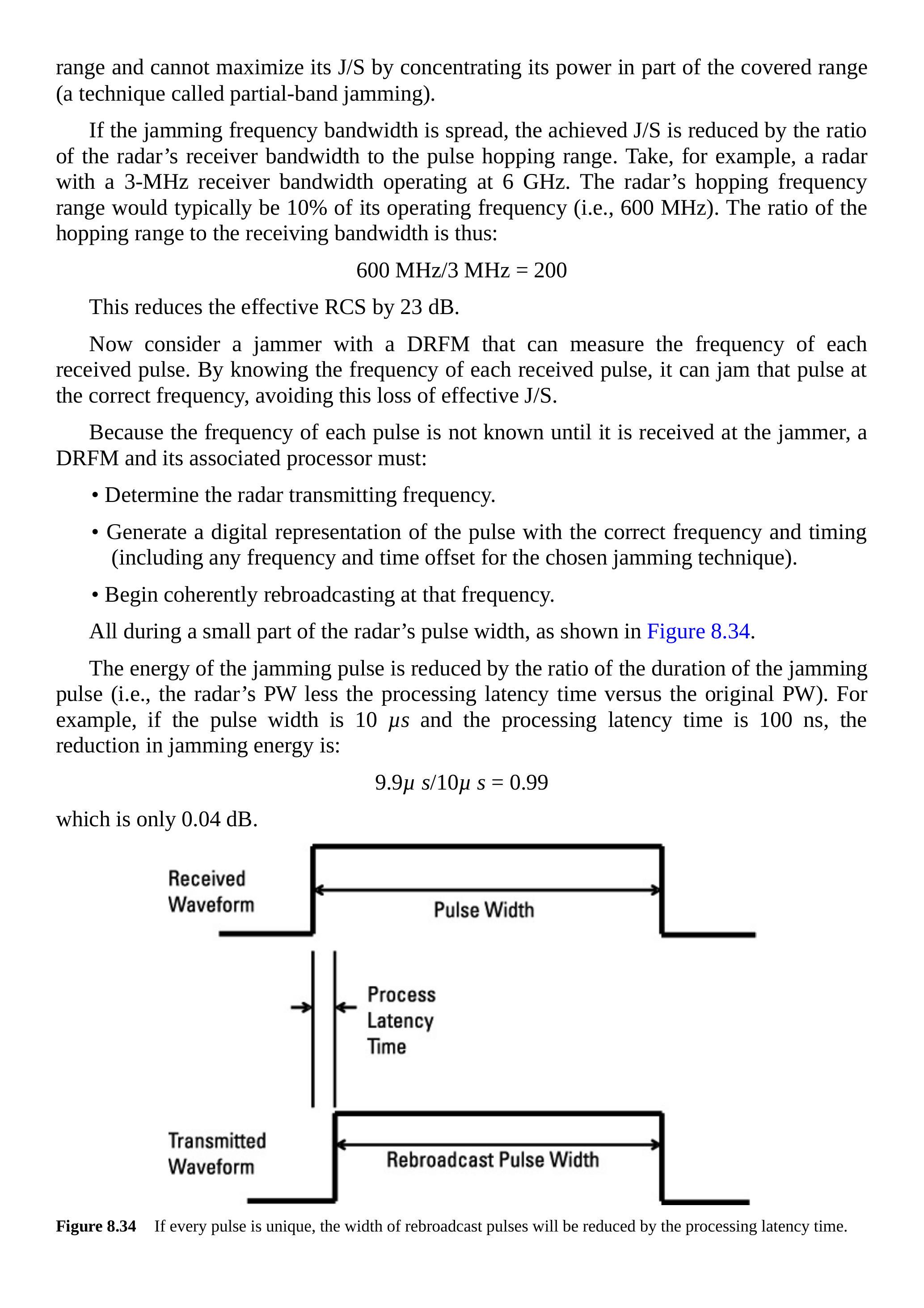 所有这些操作都在雷达脉冲宽度的一小部分时间内完成,如图 8.34 所示。干扰脉冲的能量按干扰脉冲的持续时间比例减少(即雷达脉冲宽度减去处理延迟时间与原脉冲宽度之比)。例如,如果脉冲宽度为 \(10 \mu s\),处理延迟时间为 100 ns,则干扰能量的减少为: