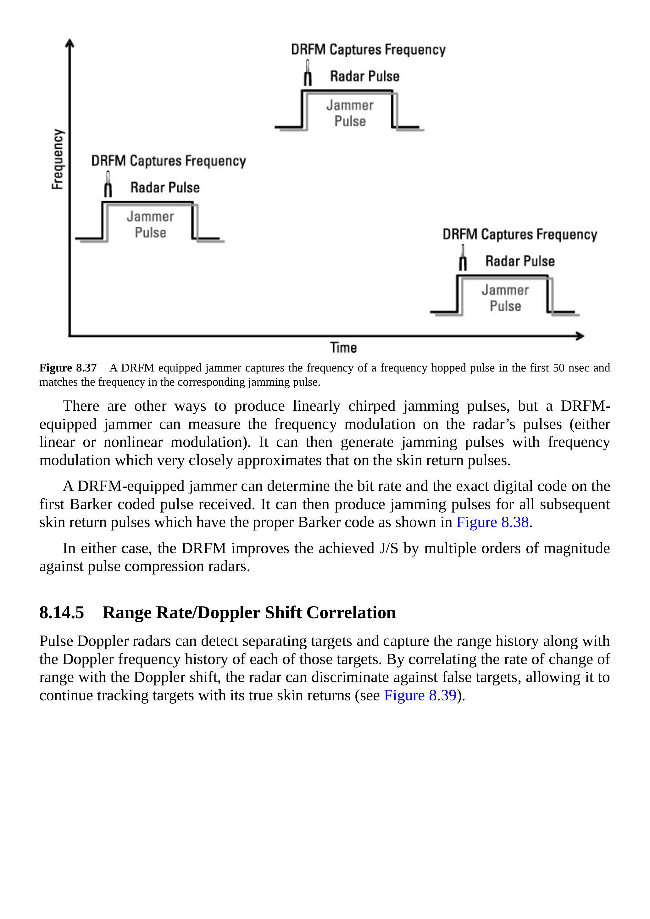 通过在每个脉冲的前 50 ns 内测量雷达频率(如图 8.37 所示),装备 DRFM 的干扰器可以生成跟随跳频的干扰信号,覆盖极大比例的皮肤回波脉冲。