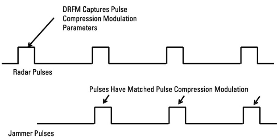 配备 DRFM 的干扰器可以同时设置干扰脉冲的脉冲时序和频率,使其与真实回波一致,从而使距离门脱锁(RGPO)、距离门拉入(RGPI)和其他假目标干扰技术有效。