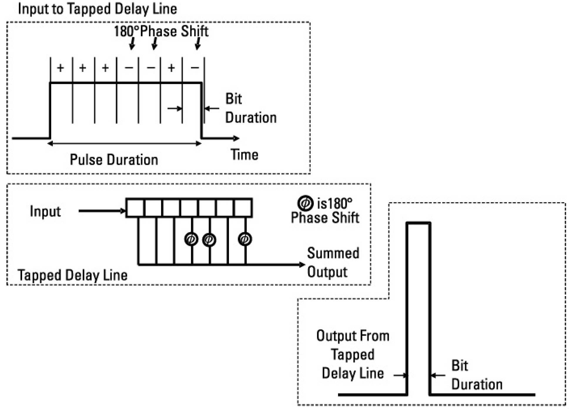 - Barker 码脉冲压缩:对每个脉冲进行二进制相移键控调制,使用 Barker 码。在雷达接收机中,有一条抽头延迟线,其级数等于码的比特数。某些输出具有 \(180^{\circ}\) 相移输出,当脉冲正好填满移位寄存器时,所有比特会相干叠加。当脉冲未完全对齐移位寄存器时,输出近似为零。这样可将接收脉冲缩短为码的 1 个比特长度,从而按每脉冲比特数压缩距离分辨率。因为没有 Barker 码的干扰脉冲不会被压缩,其有效 J/S 会按码长降低。DRFM 可以生成带正确 Barker 码的干扰脉冲,从而保持完整 J/S。