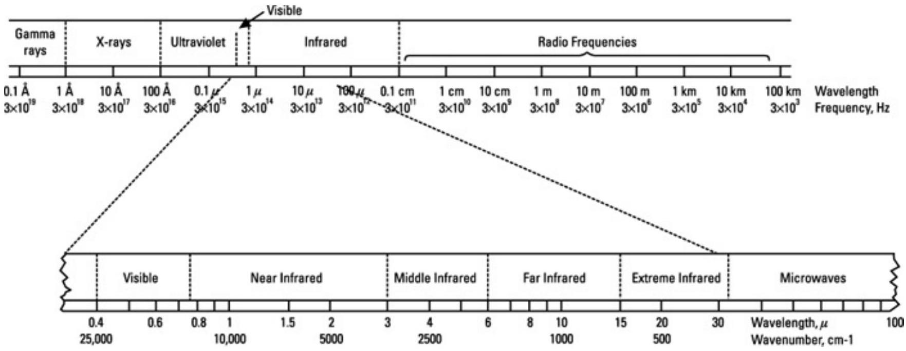 图 9.1 展示了电磁谱的扩展视图,重点是光学和红外范围。注意横轴同时标示了频率和波长。这两者之间的关系由以下公式定义: