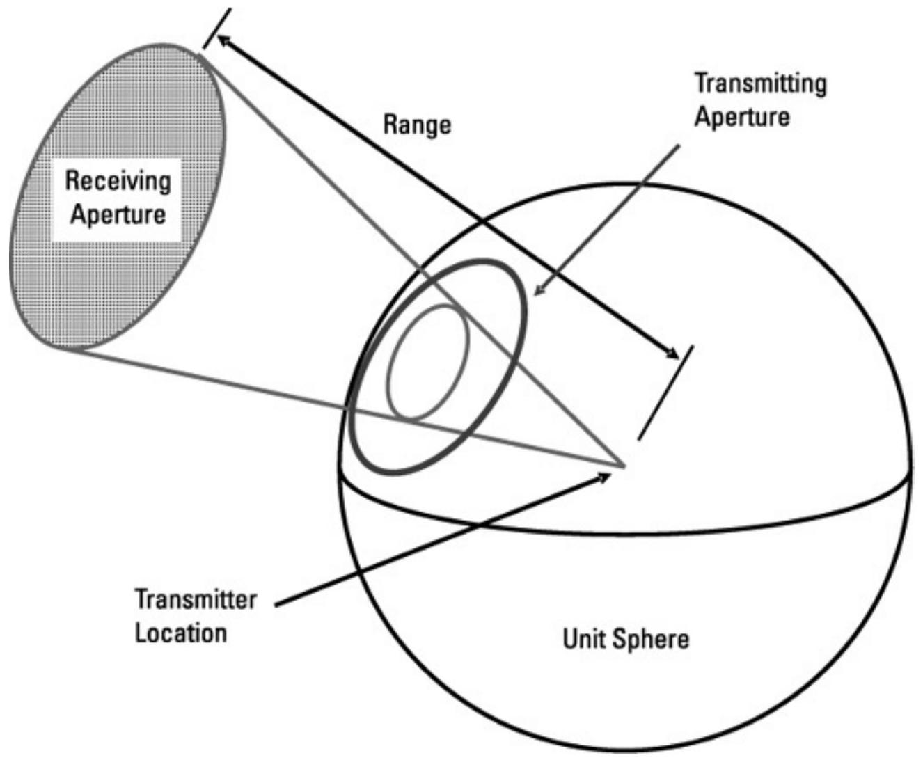 图 9.2 红外传播衰减是发射孔径与接收孔径在以发射机为中心的单位球上投影比值的函数。