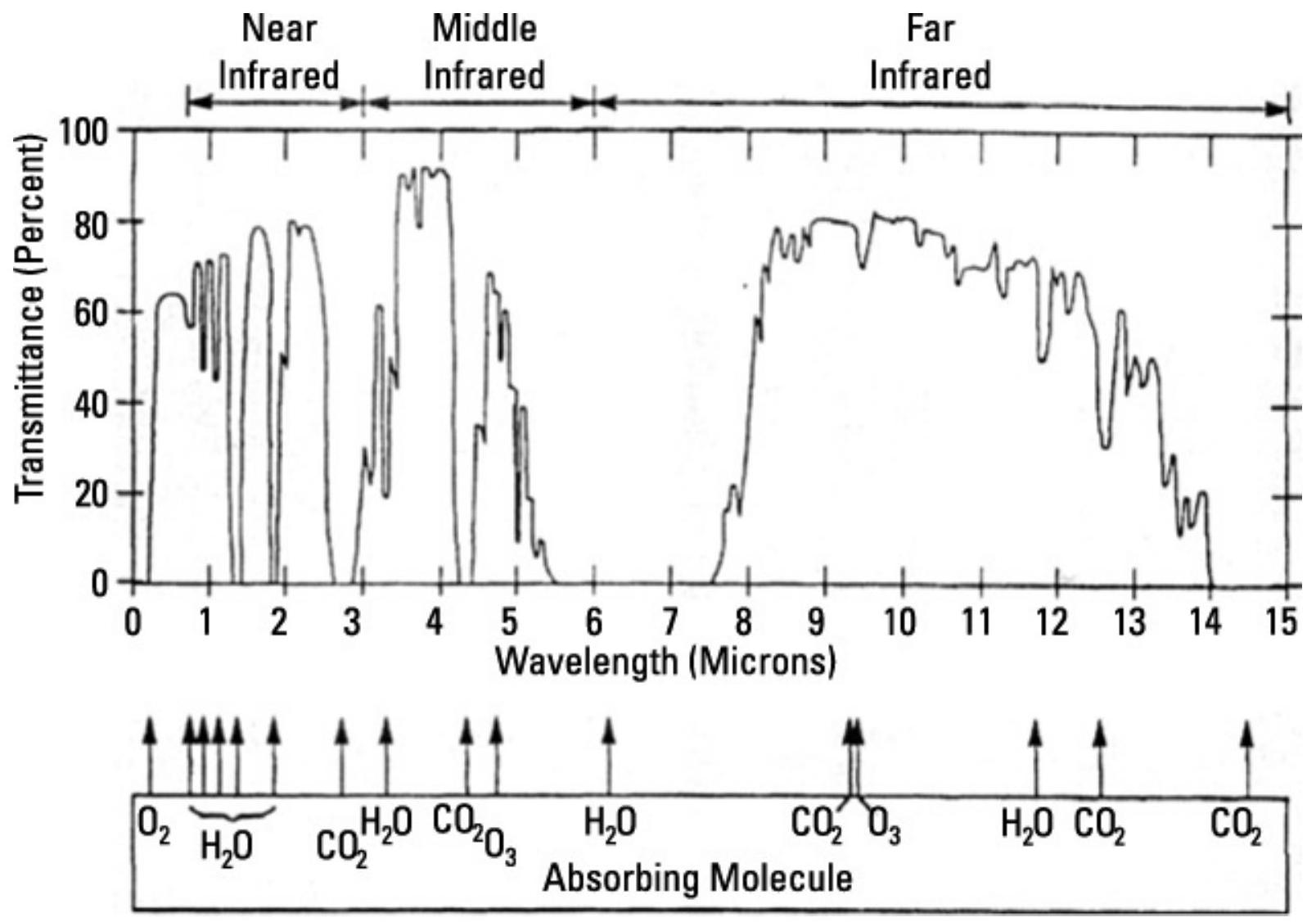 图 9.20 红外波长下的大气透过率显示了清晰定义波长范围内的传输窗口和透过衰减区。