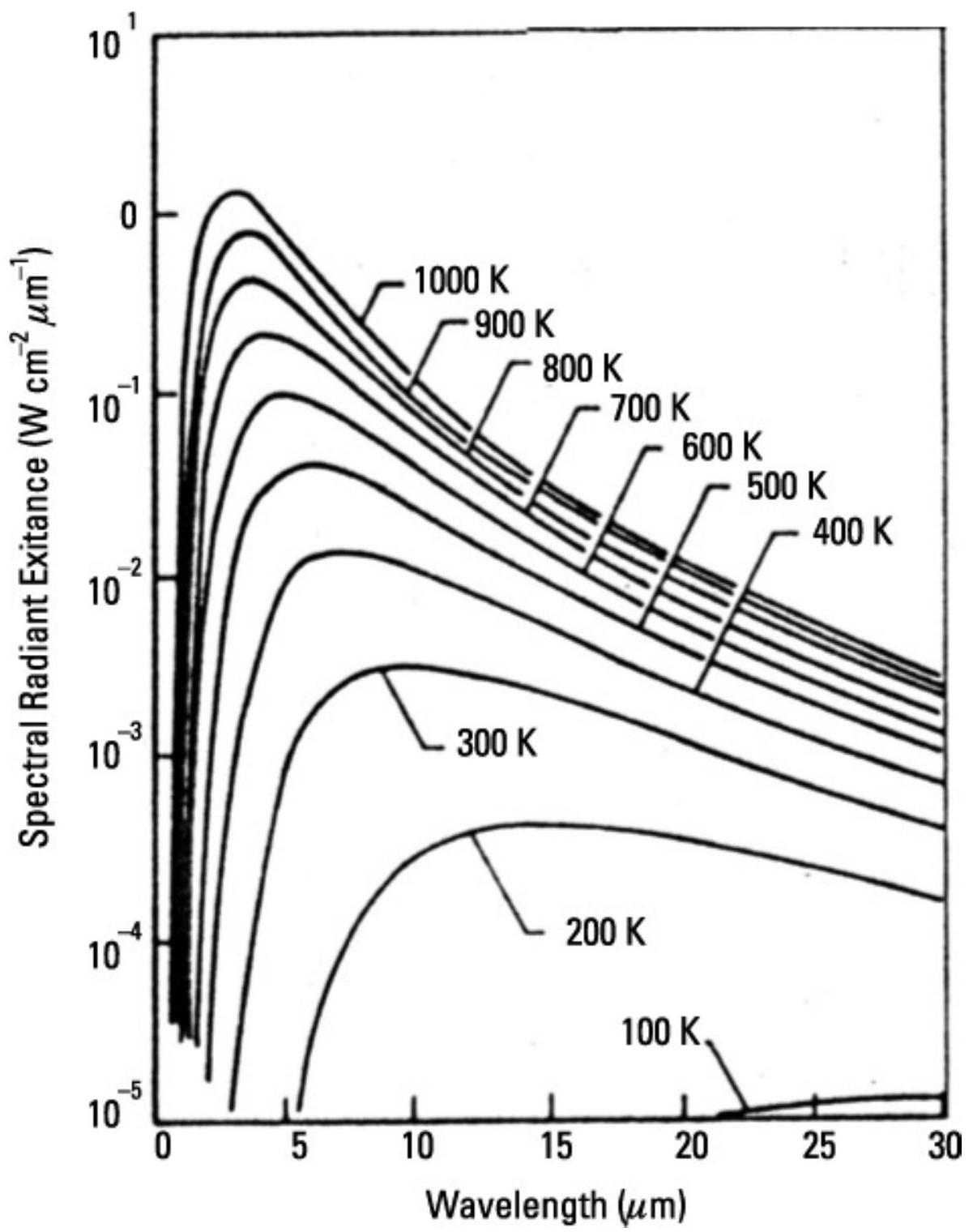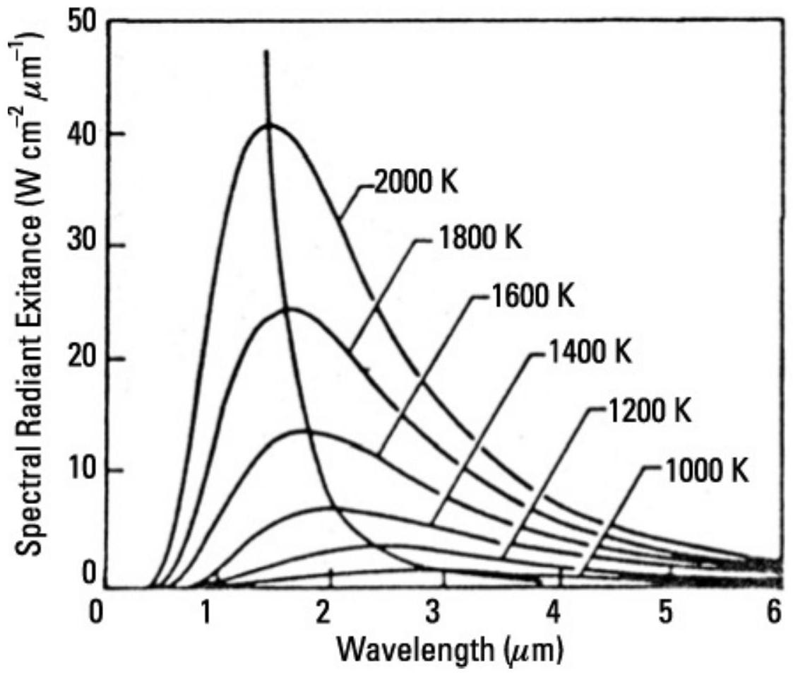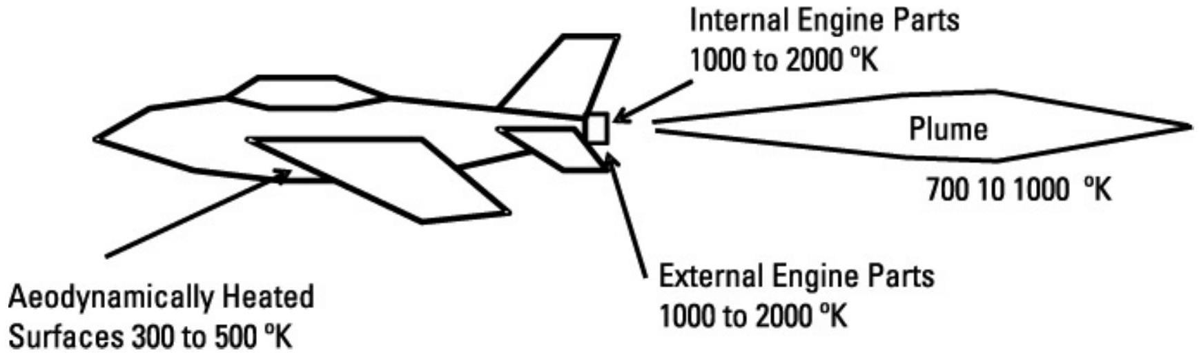 发动机内部的压缩机叶片是最热的区域,外部发动机尾管部件略凉。两者温度均在 \(1,000 \mathrm{~K}\) 到 \(2,000 \mathrm{~K}\) 之间,这意味着其能量峰值位于 1 到 2.5 微米(\(\mu \mathrm{m}\))波长范围内。发动机尾焰温度在 700 到 \(1,000 \mathrm{~K}\) 之间,因此其能量峰值在 3 到 5 微米波长范围内。空气动力加热的机身表面,例如机翼前缘,温度预计在 300 K 到 500 K,因此这些区域的能量峰值在 8 到 13 微米范围内。参考 9.3 节中讨论的温度与峰值波长关系。