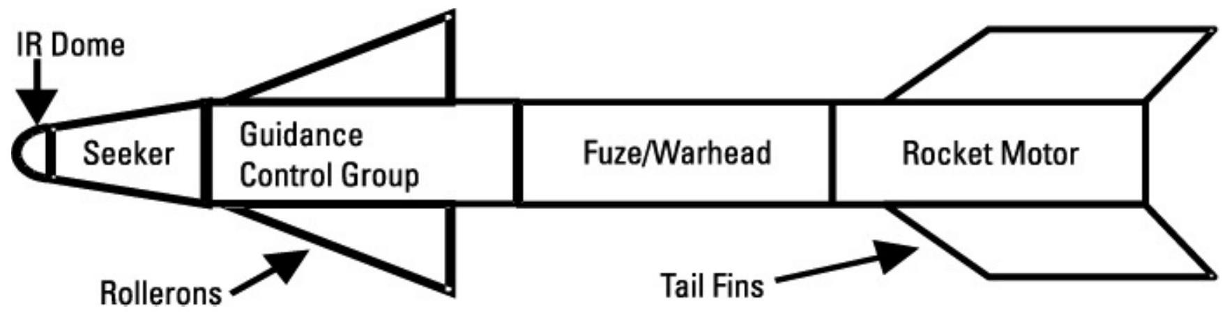 图 9.6 是一枚热追踪导弹的示意图。导弹头部有一枚在红外波长下透明的透镜,透镜后面是红外导引头,它产生的信号用于导引与控制电路判断目标方向。导引与控制组控制舵面,例如滚轮舵(rollerons),以调整飞行方向。随后是引信与弹头。由于导弹会自动追踪目标,因此在许多情况下可以使用接触引信。最后是固体火箭发动机和稳定尾翼。