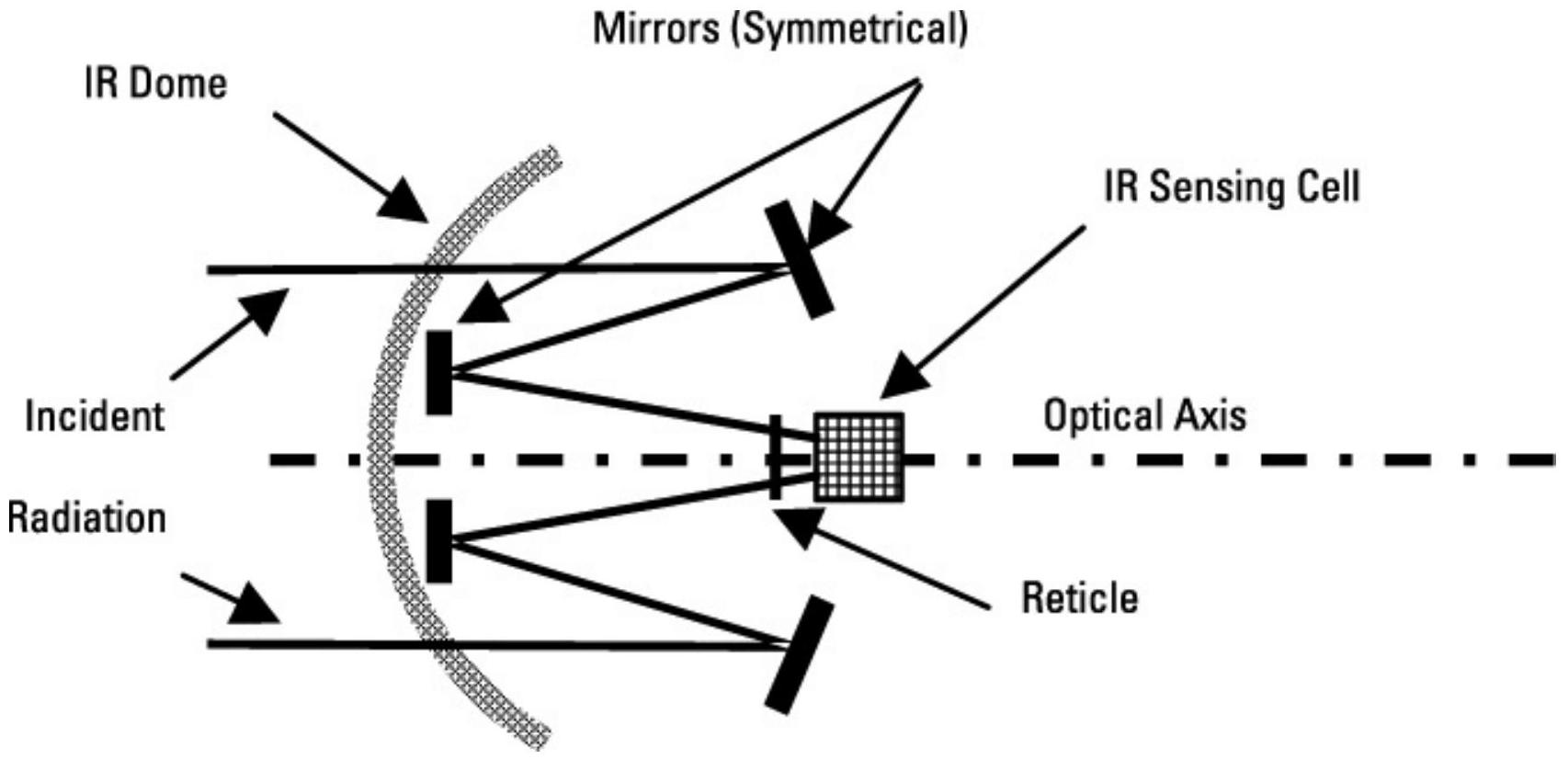 图 9.7 红外导引头通过光栅将接收到的红外能量聚焦到感应单元上。