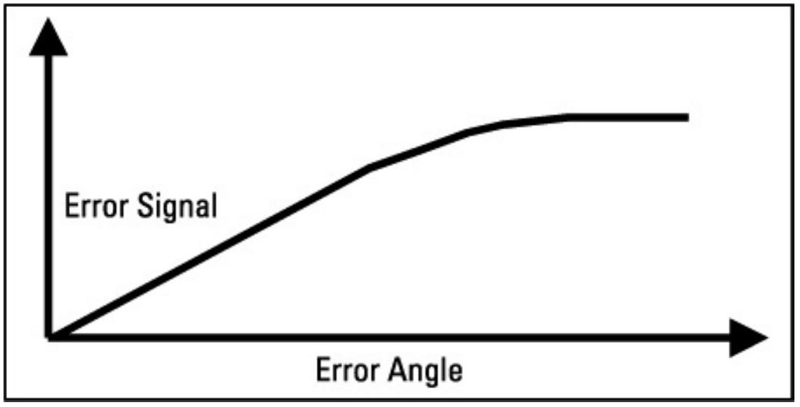 光栅有多种类型,具有不同特性。图 9.9 显示了早期红外导弹使用的“旭日”光栅。这种光栅一半区域透过率为 \(50\%\),另一半则是交替的透明和不透明楔形。这会使进入感应单元的红外能量呈现图 9.10 所示的功率随时间变化特性。当导引头指向目标的向量进入光栅的交替区域时,方波部分立即开始。该功率随时间变化的模式使感应单元向导引与控制组输出相同模式的电流。随着目标方向的变化,方波部分开始的时间会相应调整。因此,导引与控制组可以生成适当的舵面指令,将导引头的光学轴对准目标。当红外目标方向接近光栅中心时,其能量会因透明楔的变窄而减少(即目标的一部分被不透明楔挡住)。因此,误差信号随舵偏角变化,如图 9.11 所示。这个设计的一个问题是,光栅边缘信号能量较大,会覆盖中心目标的信号能量,因此当导弹跟踪光栅中心附近目标时,光栅边缘的干扰弹会产生更大信号,使导弹更容易被干扰。另一个问题是,最终瞄准点出现在感应单元接收到信号最小值的位置。后续章节将讨论其他几种光栅类型,以克服这些及其他问题。