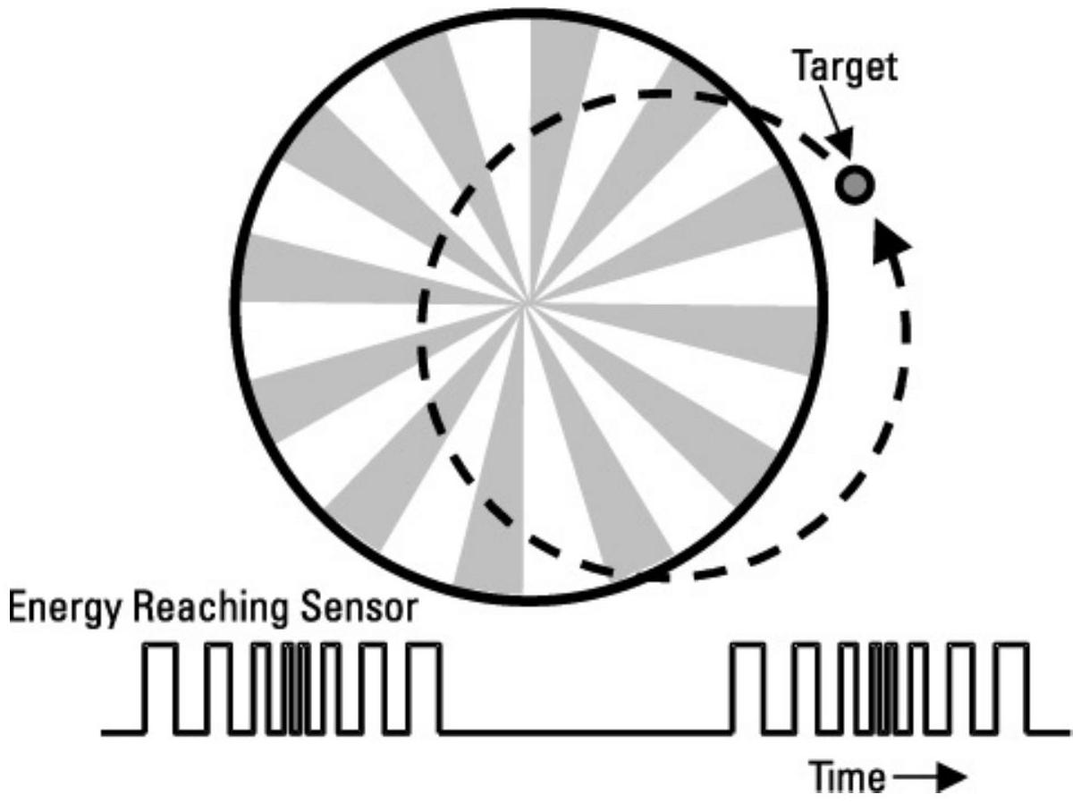 注意,不透明区域的形状导致目标经过的辐条数量随目标与光学轴之间的角度而变化。如果目标靠近光栅外缘,将产生七个脉冲的能量覆盖一半时间。随着目标向光学轴移动,能量脉冲数量增加,脉冲占据时间比例也增加。当目标非常接近光学轴时,有 11 个能量脉冲,脉冲几乎占据光栅旋转的 100% 时间。这允许实现与多频光栅相同的比例制导。