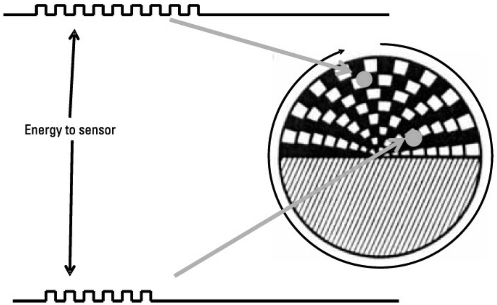 图 9.10 随着光栅的交替部分经过红外目标,进入感应单元的红外能量呈 50% 占空比方波模式。