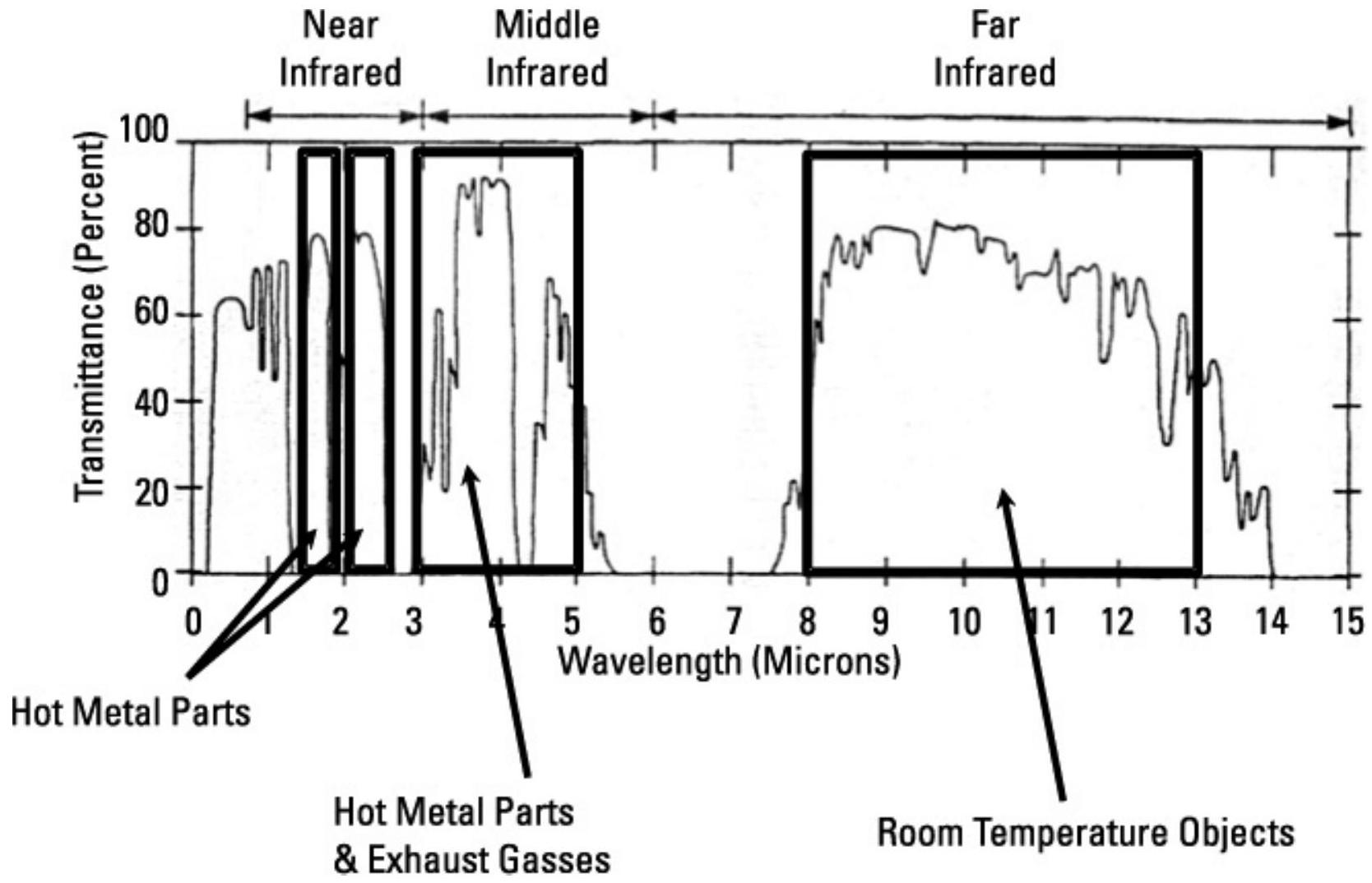 像尾管或发动机内部部件这样的高温目标在近红外区域被跟踪,尾焰在中红外区域被跟踪,受加热的机身表面在远红外区域被跟踪。一般而言,热追踪导弹倾向于瞄准更高温度的目标。
