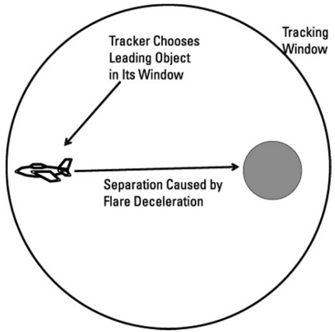 如果导弹从飞机的侧翼攻击,燃烧弹的方位角变化率将远大于目标的变化率。通过感测方位角变化率,导弹跟踪器可以检测到燃烧弹的存在,并在燃烧弹离开跟踪窗口之前停止跟踪。请注意,从目标飞机的正面或尾部攻击时,角分离会被看到更小,因此这种防御效果会大大减弱。