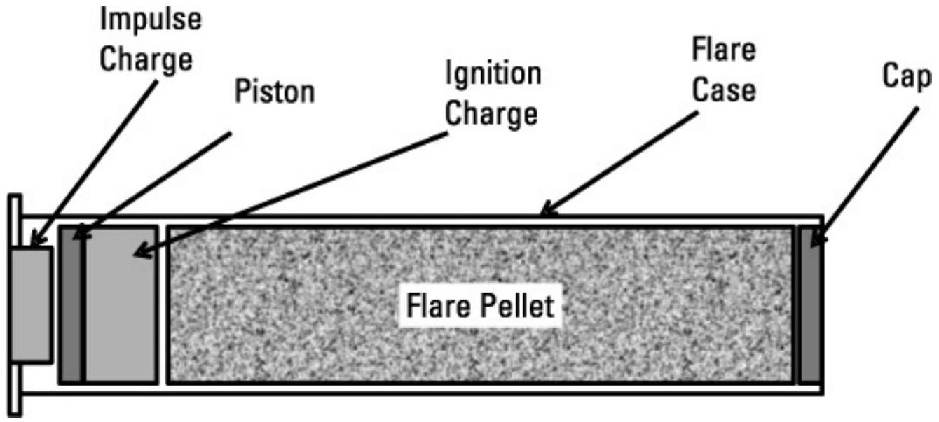 燃烧弹被放置在飞机上的燃烧弹仓中。仓体由铝制成,内装有玻璃纤维弹匣,实际燃烧弹放置其中并从中发射。美国海军使用圆柱形燃烧弹,尺寸必须相同(直径 36 mm,长度 148 mm)。美国空军和陆军使用尺寸为 \(1 \times 1\) 英寸或 \(1 \times 2\) 英寸、长度 8 英寸的燃烧弹,空军还使用 \(2 \times 2 \times 8\) 英寸的燃烧弹。这些是北约标准尺寸。较大的燃烧弹提供更高能量,以克服大型飞机发动机的红外特征。各国和不同类型飞机还使用多种尺寸和形状的燃烧弹。所有类型的燃烧弹都包含从飞机发射并产生热目标的材料,用以引导热追踪导弹远离受保护目标。燃烧弹可以是烟火型或自燃型。