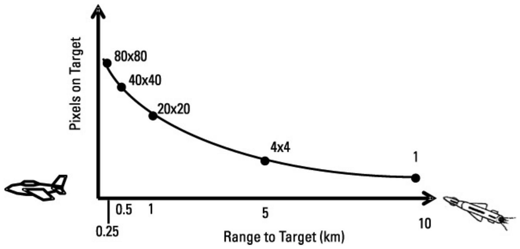 如同所有光学设备,像素数量决定了可实现的分辨率。一般而言,成像跟踪器通常被认为是末端制导装置,因为其像素数量相对较少。因此,为了在目标上获得足够像素以确认其为跟踪目标,导弹(携带跟踪器)必须相对靠近目标。有些文献指出,在目标获取范围内,大约可有 20 个像素接收目标能量。对此点将在后续章节进行更详细的讨论。