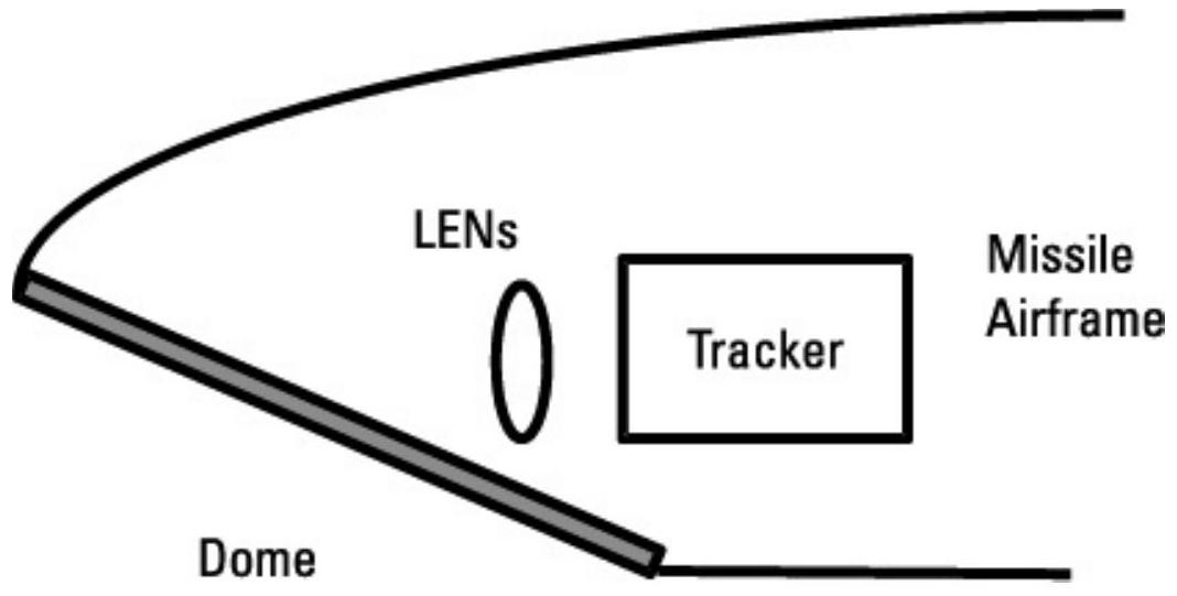 图 9.38 圆顶可以是安装在导弹机体角度上的平板材料,以最小化气动阻力和加热,提高热信号噪声比。透镜安装在圆顶后的万向节上,以提供较大的视场(FOR)。