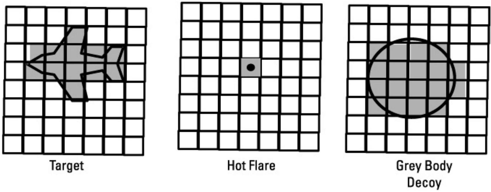 我们已经讨论了通过创造较大热轮廓来捕获导弹寻的器的红外诱饵,以及易受这些诱饵攻击的导弹跟踪器类型。现在我们考虑一种新型导弹跟踪器,它可以根据导弹跟踪器检测到的能量图案形状来区分诱饵。早期的成像跟踪器使用扫描线性阵列来捕获跟踪器视场中的场景。这些跟踪器体积大且重量重(约 40 磅)。武器化焦平面阵列(FPA)的发展现在允许使用凝视阵列,其像素可达 \(256 \times 256\),且跟踪器重量仅约 8 磅(包括允许长时间连续操作的回收式制冷器)。