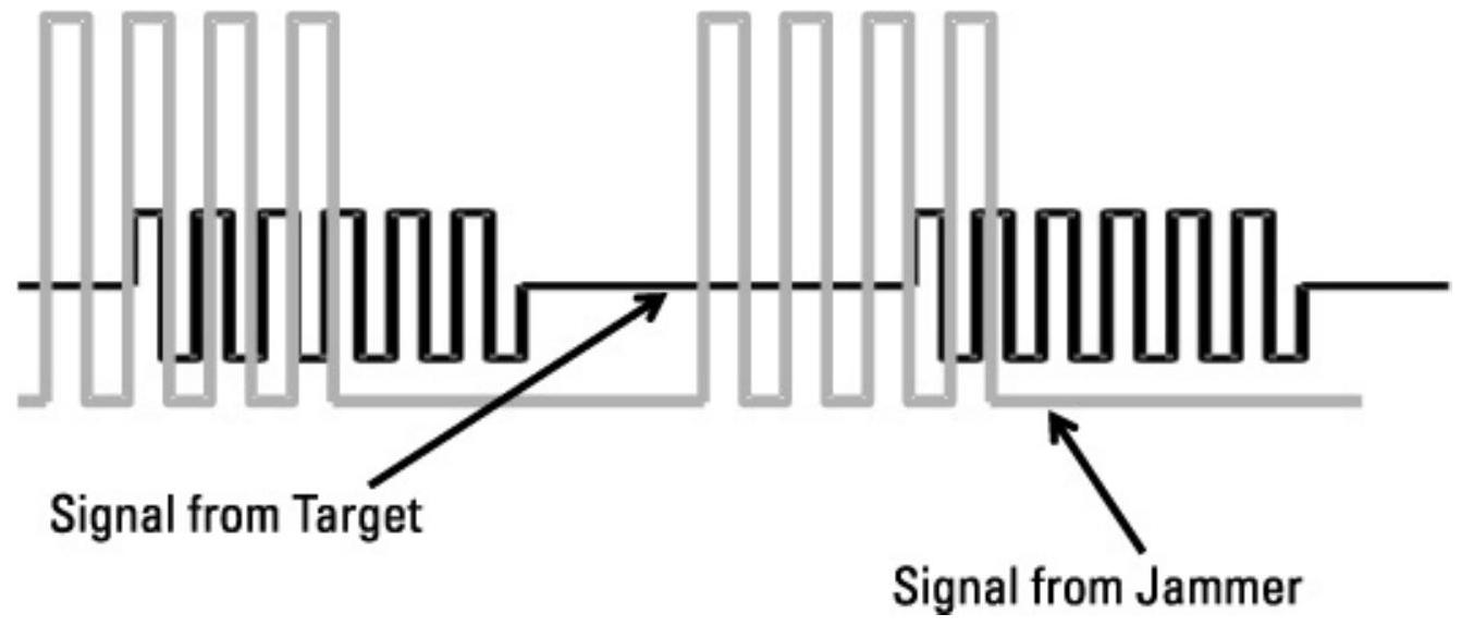 图 9.45 显示了某种导弹类型的目标红外能量(经过光栅后)生成的视频,同时显示了干扰信号。这两种红外能量模式进入传感单元,它们的组合能量模式在处理器中产生复杂的视频信号模式。注意这种组合模式如何阻止处理器准确确定脉冲群中的脉冲数量、脉冲群的时序或视频脉冲的幅度。还要注意干扰器的视频信号比目标的信号大得多,这是干扰信号与目标信号比(J/S)的结果,此处为接收的干扰能量与接收的目标信号能量的比值。
