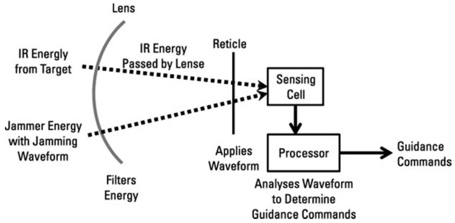红外干扰器产生调制的红外发射,传向来袭导弹,并向传感单元输入调制能量。该能量会导致处理器输出错误的跟踪信息,要么打破对目标的锁定,要么将导弹引导偏离其预定目标。