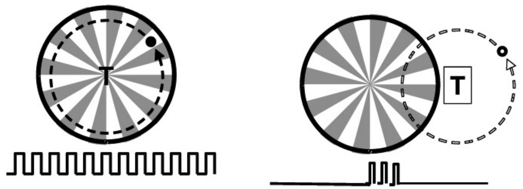 马车轮光栅不是旋转的,而是摆动(nutated),以形成圆锥扫描模式。这使得目标在跟踪窗口内呈圆形移动。如图 9.12 所示,当目标偏离轴线时,进入感应单元的能量呈现多次不均匀脉冲。要将目标置于跟踪器中心,必须将跟踪器光学轴沿最窄脉冲的反方向移动。注意,当目标位于跟踪器光学轴中心时,光栅的透明与不透明部分会使传感器接收到恒定方波能量,如图 9.13 所示。图 9.9 中的旭日光栅会随着目标接近光学轴而使每个脉冲能量减小,当跟踪器直接瞄准目标时产生零信号。马车轮光栅的优点是目标居中时信号强。