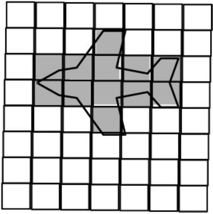目标飞机在不同距离下所覆盖的像素数量如图 9.36 所示。在典型的 10 km 探测距离下,目标占据 1 或 2 个像素。在 5 km 时覆盖 \(4 \times 4\) 像素,1 km 时覆盖 \(20 \times 20\) 像素,500 m 时覆盖 \(40 \times 40\) 像素,250 m 时覆盖 \(80 \times 80\) 像素。