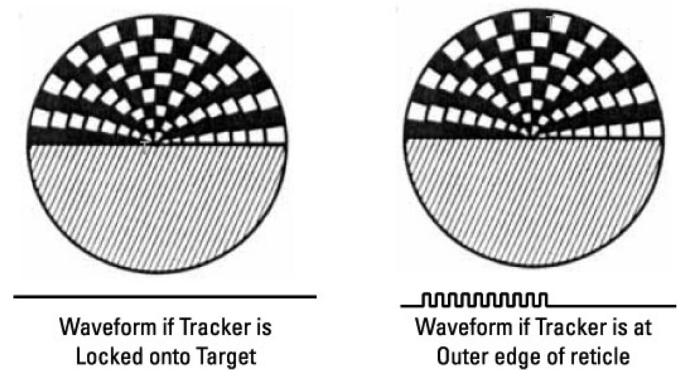 如图 9.14 所示的光栅会像旭日光栅一样,在一半时间内向传感器产生一系列能量脉冲。然而,当目标经过光栅的透明/不透明区域时,传感器接收到的脉冲数量会随目标方向与跟踪器光学轴之间的角度而变化。跟踪器只跟踪单一目标,但图中显示两个目标以说明不同的能量模式。图中顶部的目标比图中接近中心的目标距离光学轴更远。注意,上部目标产生九个脉冲的模式,而下部目标仅产生六个脉冲的模式。这使得跟踪逻辑能够确定角跟踪误差的大小,从而进行正确的舵面修正。与旭日光栅跟踪器类似,导弹必须转向的方向以将目标置于跟踪器中心,是根据脉冲模式开始的时间确定的。