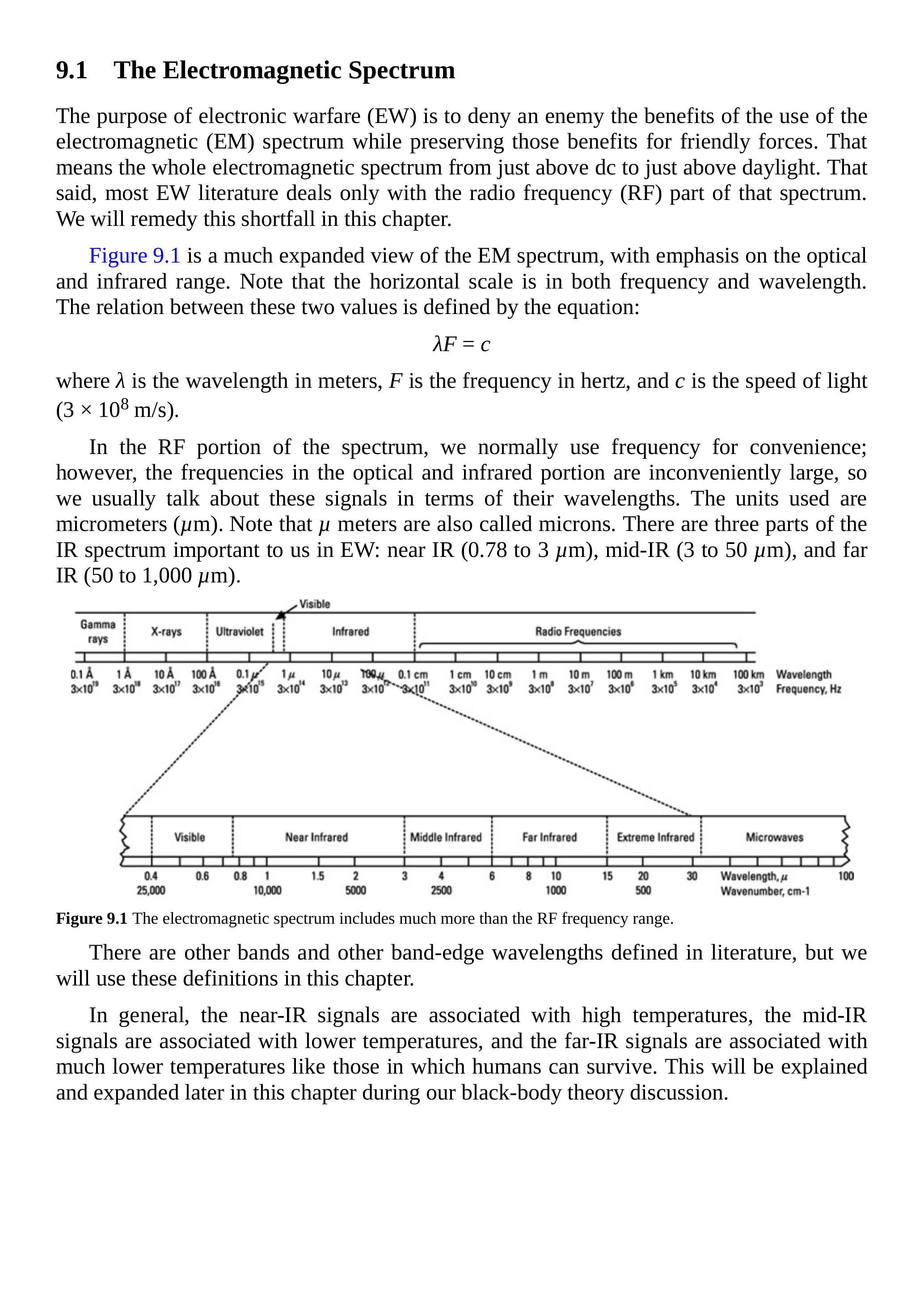在射频部分,为了方便我们通常使用频率表示;然而,在光学和红外部分,频率数值过大,因此我们通常用波长来描述这些信号,单位为微米(\(\mu \mathrm{m}\))。注意,微米也称作微米(micron)。红外谱中有三个对电子战重要的部分:近红外(0.78 到 \(3 \mu \mathrm{m}\))、中红外(3 到 \(50 \mu \mathrm{m}\))和远红外(50 到 \(1,000 \mu \mathrm{m}\))。
