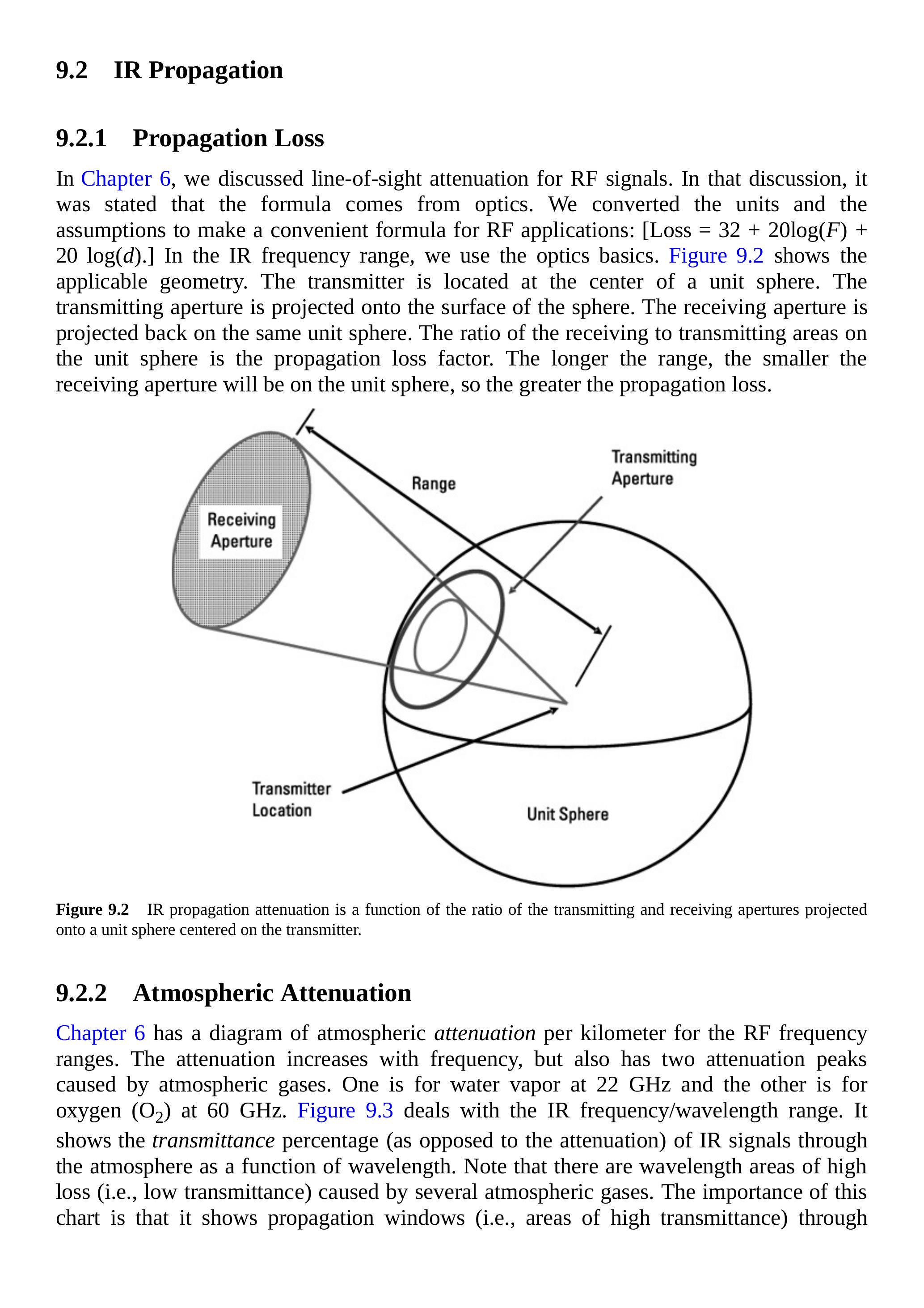 在第 6 章中,我们讨论了射频信号的视距衰减。讨论中指出,该公式源自光学。我们通过单位转换和假设,得出了便于射频应用的公式:[Loss \(=32+20 \log (F)+ 20 \log (d)\)]。在红外频段,我们直接使用光学基础。图 9.2 显示了相关几何关系。发射机位于单位球的中心,发射孔径投影到球面上,接收孔径投影回同一单位球上。接收面积与发射面积在单位球上的比值即为传播损耗因子。距离越长,在单位球上的接收孔径越小,因此传播损耗越大。