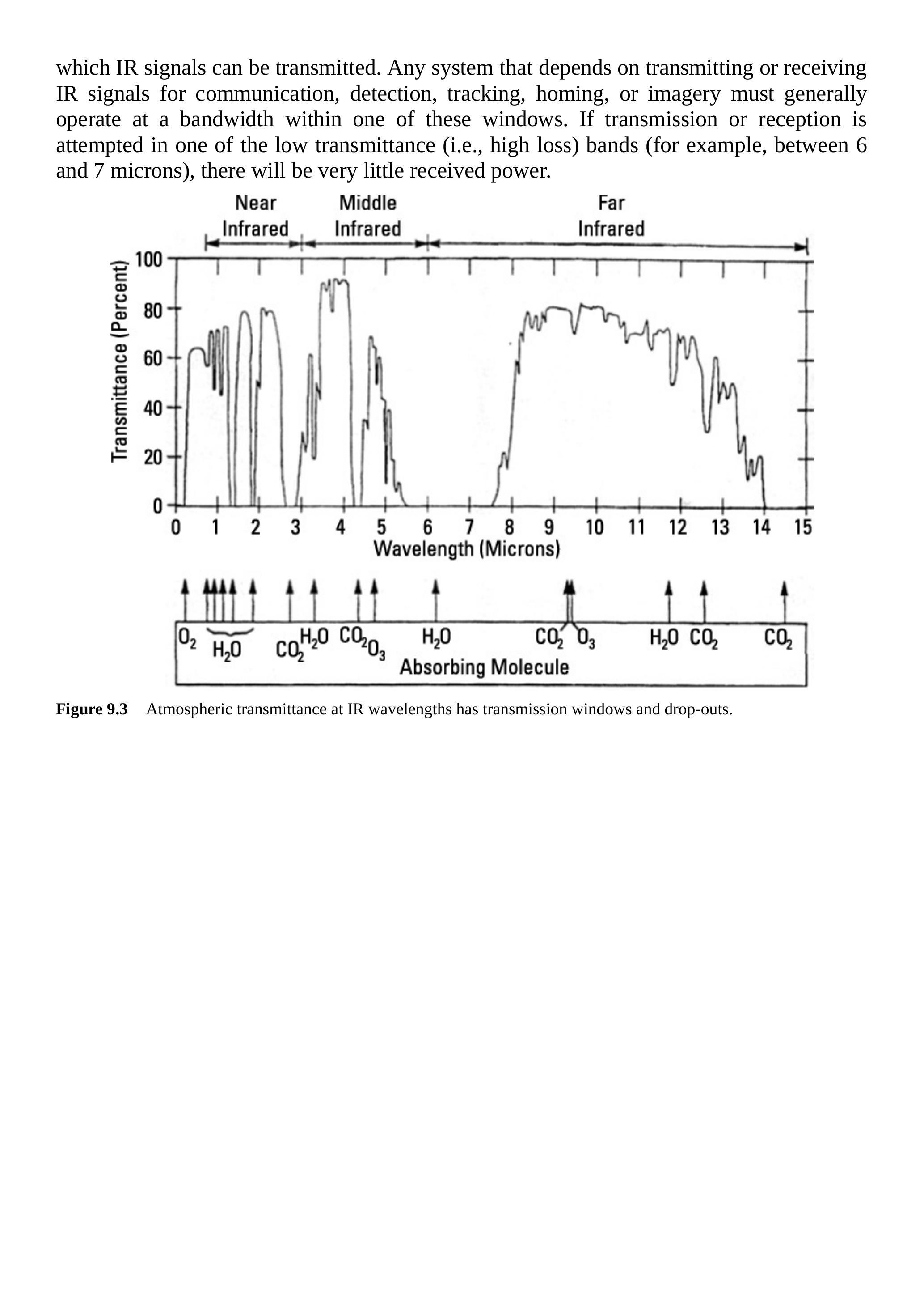 第 6 章中有一张射频频段每公里大气衰减的示意图。衰减随频率增加而增大,但也存在两个由大气气体引起的衰减峰值:一个是水汽在 22 GHz,另一个是氧气(\(\mathrm{O}_{2}\))在 60 GHz。图 9.3 展示了红外频率/波长范围内的情况。它显示了红外信号通过大气的透过率百分比(与衰减相对),随波长变化的情况。注意,由几种大气气体造成的高损耗(即低透过率)波长区域。该图的重要性在于,它显示了红外信号可以传输的传播窗口(即高透过率区域)。任何依赖红外信号进行通信、探测、跟踪、制导或成像的系统,一般都必须在这些窗口的带宽内操作。如果尝试在低透过率(即高损耗)波段进行发射或接收(例如 6 到 7 微米之间),接收到的功率将非常低。