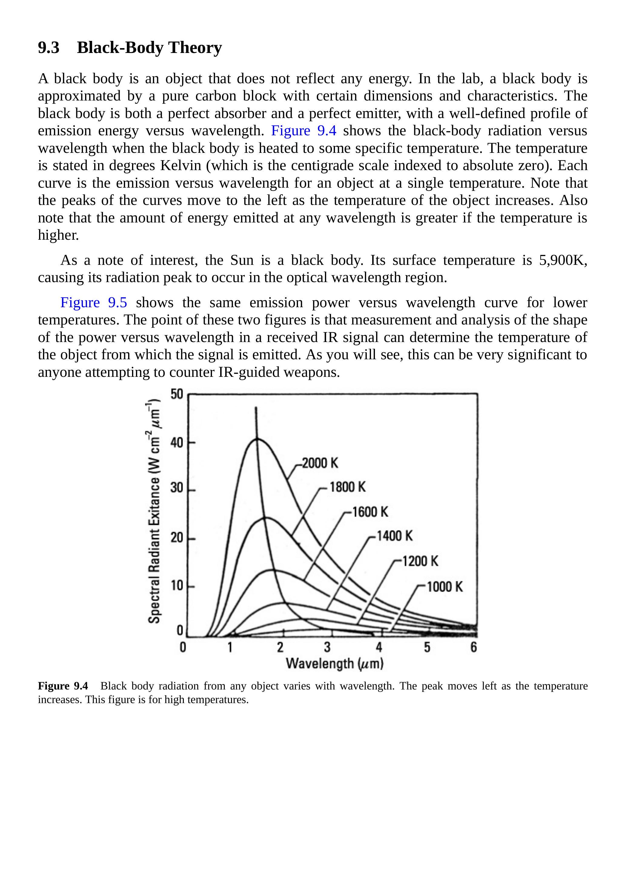 图 9.5 显示了较低温度下的发射功率与波长曲线。这两幅图的意义在于,通过测量和分析接收红外信号中功率随波长的形状,可以确定信号发射源的温度。正如后文将看到的,这对于试图对抗红外制导武器的人来说非常重要。