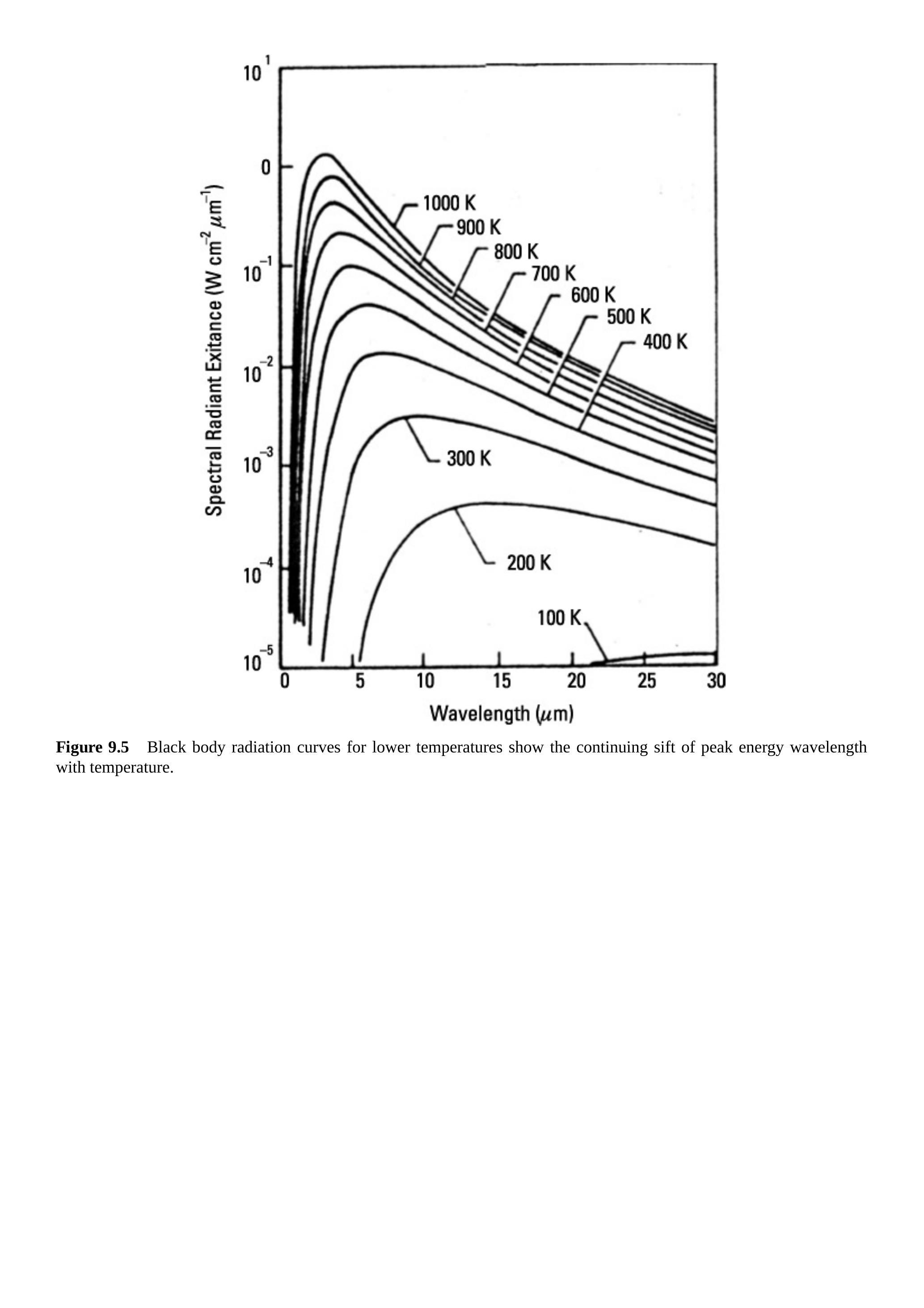 图 9.5 较低温度下的黑体辐射曲线显示峰值能量波长随温度持续变化。