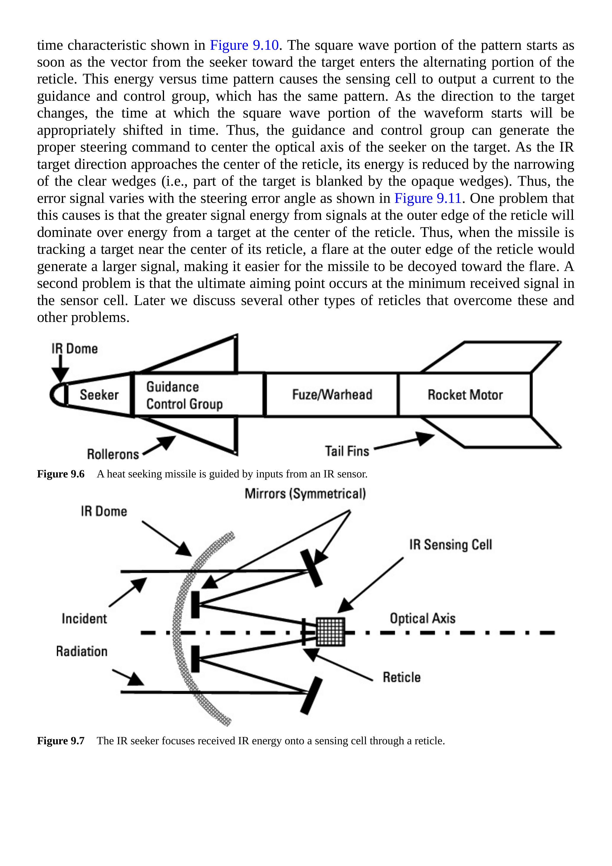 图 9.6 是一枚热追踪导弹的示意图。导弹头部有一枚在红外波长下透明的透镜,透镜后面是红外导引头,它产生的信号用于导引与控制电路判断目标方向。导引与控制组控制舵面,例如滚轮舵(rollerons),以调整飞行方向。随后是引信与弹头。由于导弹会自动追踪目标,因此在许多情况下可以使用接触引信。最后是固体火箭发动机和稳定尾翼。