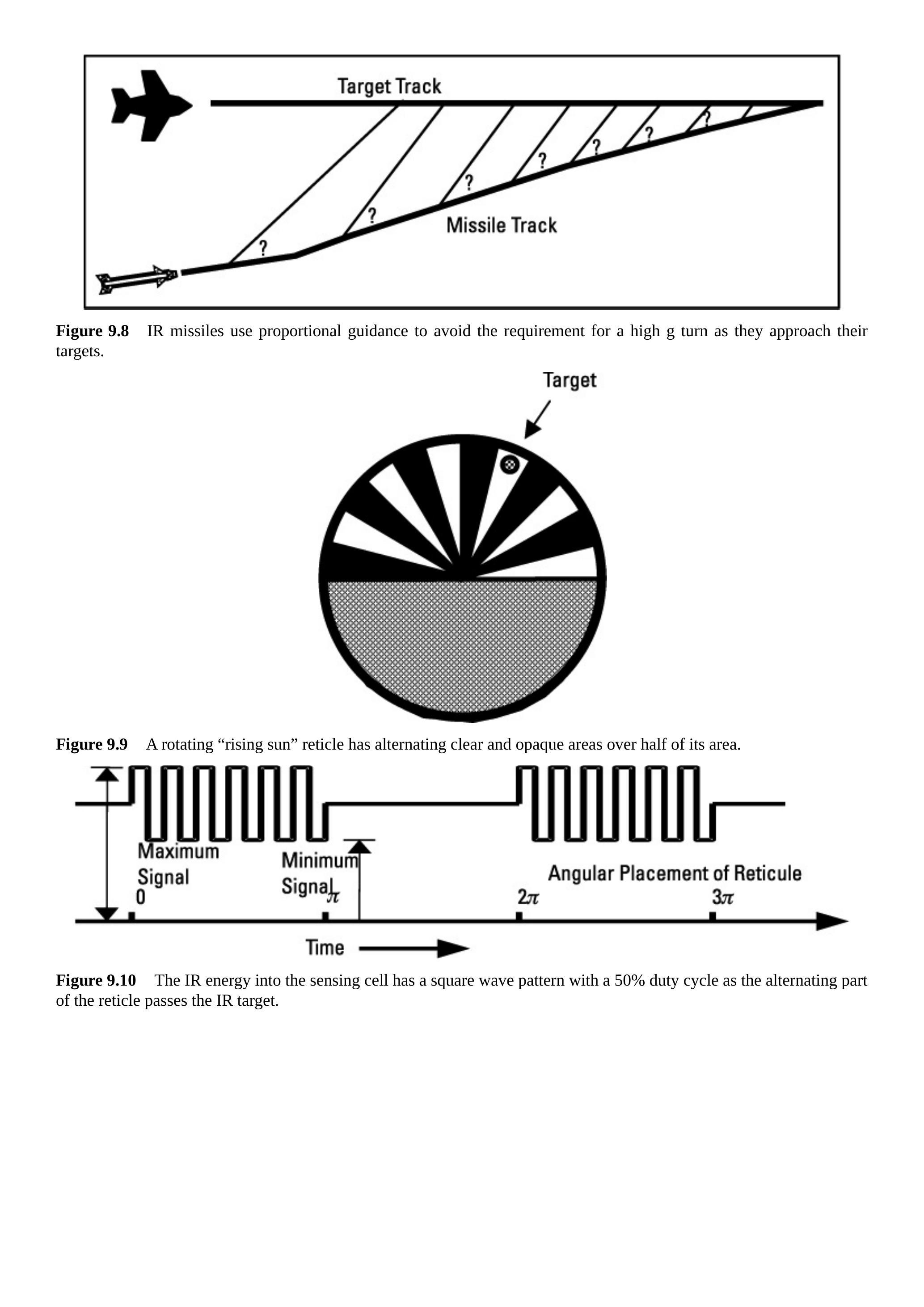 图 9.44 显示了前面描述的一些光栅类型及其向传感单元输出的红外能量模式。处理器使用传感单元的视频脉冲的时间或宽度来确定导弹必须被引导的方向以追踪目标飞机。在某些导弹中,每个脉冲群的脉冲幅度或脉冲数量决定跟踪器光轴相对于目标方向的角偏移量。