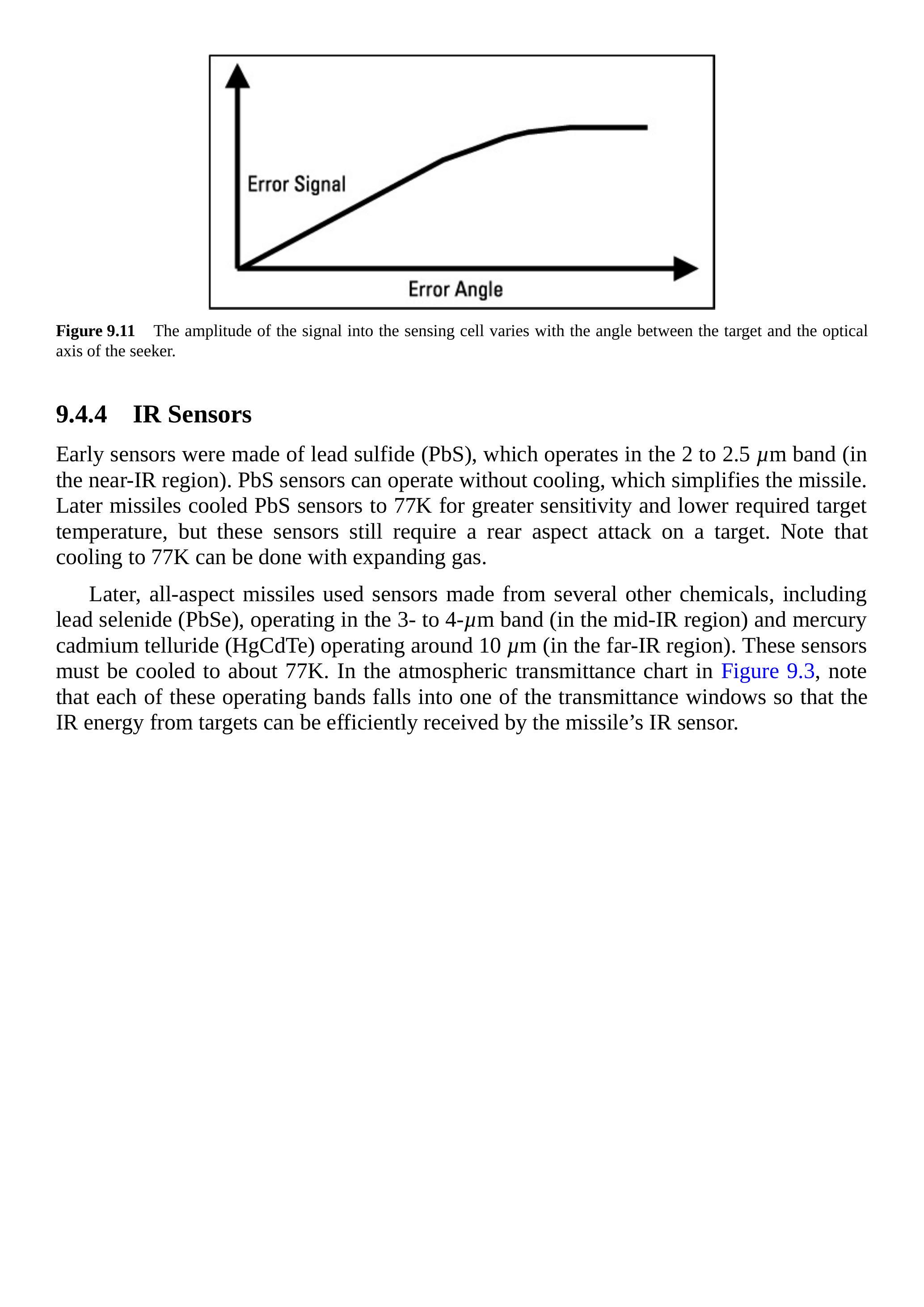 早期传感器由硫化铅(PbS)制成,工作波段为 2 到 \(2.5 \mu \mathrm{m}\)(近红外区域)。PbS 传感器无需冷却即可工作,这简化了导弹设计。后期导弹将 PbS 传感器冷却至 77 K,以提高灵敏度并降低目标所需温度,但这些传感器仍需从目标尾部发起攻击。注意,冷却至 77 K 可以通过膨胀气体实现。