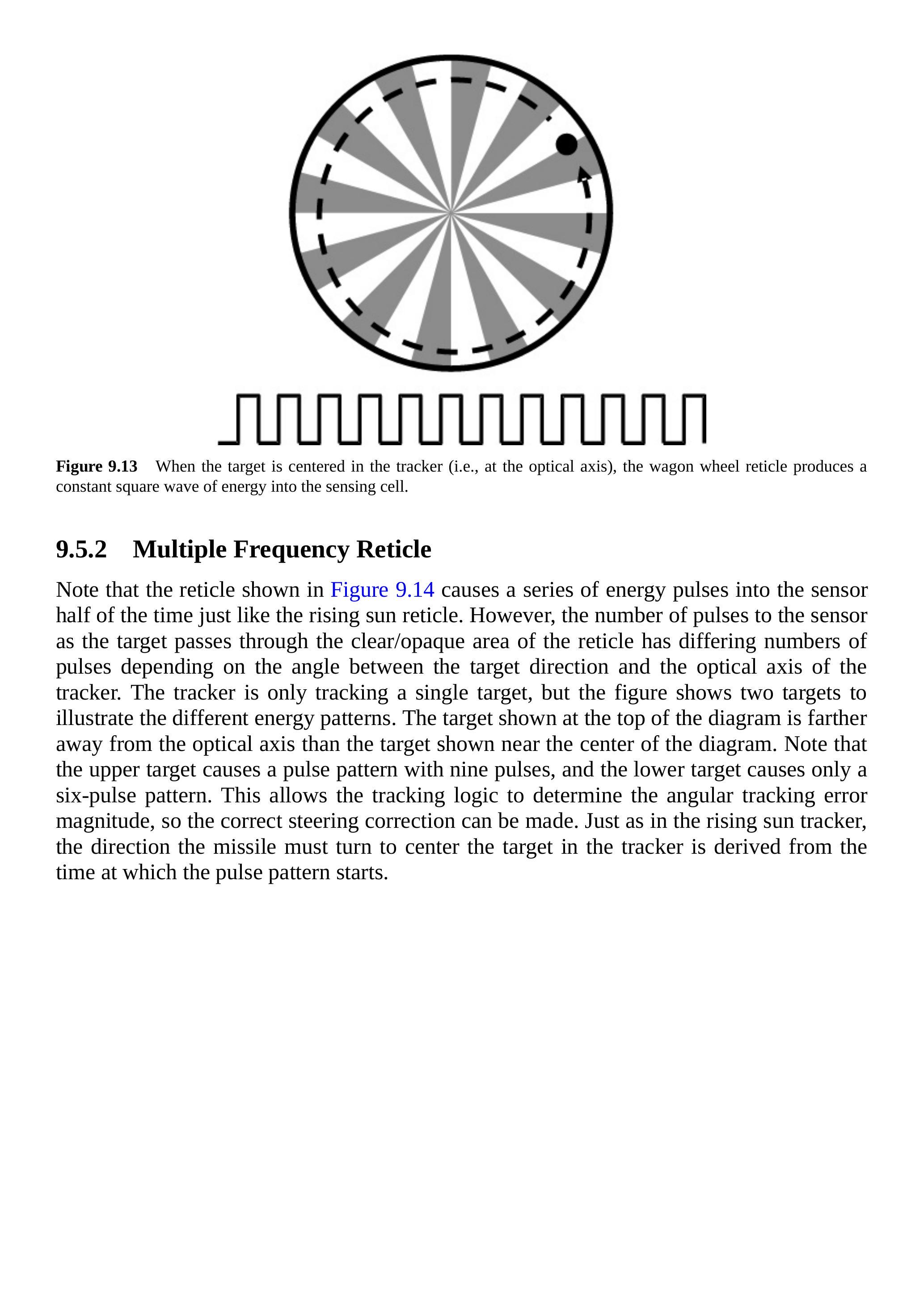 马车轮光栅不是旋转的,而是摆动(nutated),以形成圆锥扫描模式。这使得目标在跟踪窗口内呈圆形移动。如图 9.12 所示,当目标偏离轴线时,进入感应单元的能量呈现多次不均匀脉冲。要将目标置于跟踪器中心,必须将跟踪器光学轴沿最窄脉冲的反方向移动。注意,当目标位于跟踪器光学轴中心时,光栅的透明与不透明部分会使传感器接收到恒定方波能量,如图 9.13 所示。图 9.9 中的旭日光栅会随着目标接近光学轴而使每个脉冲能量减小,当跟踪器直接瞄准目标时产生零信号。马车轮光栅的优点是目标居中时信号强。