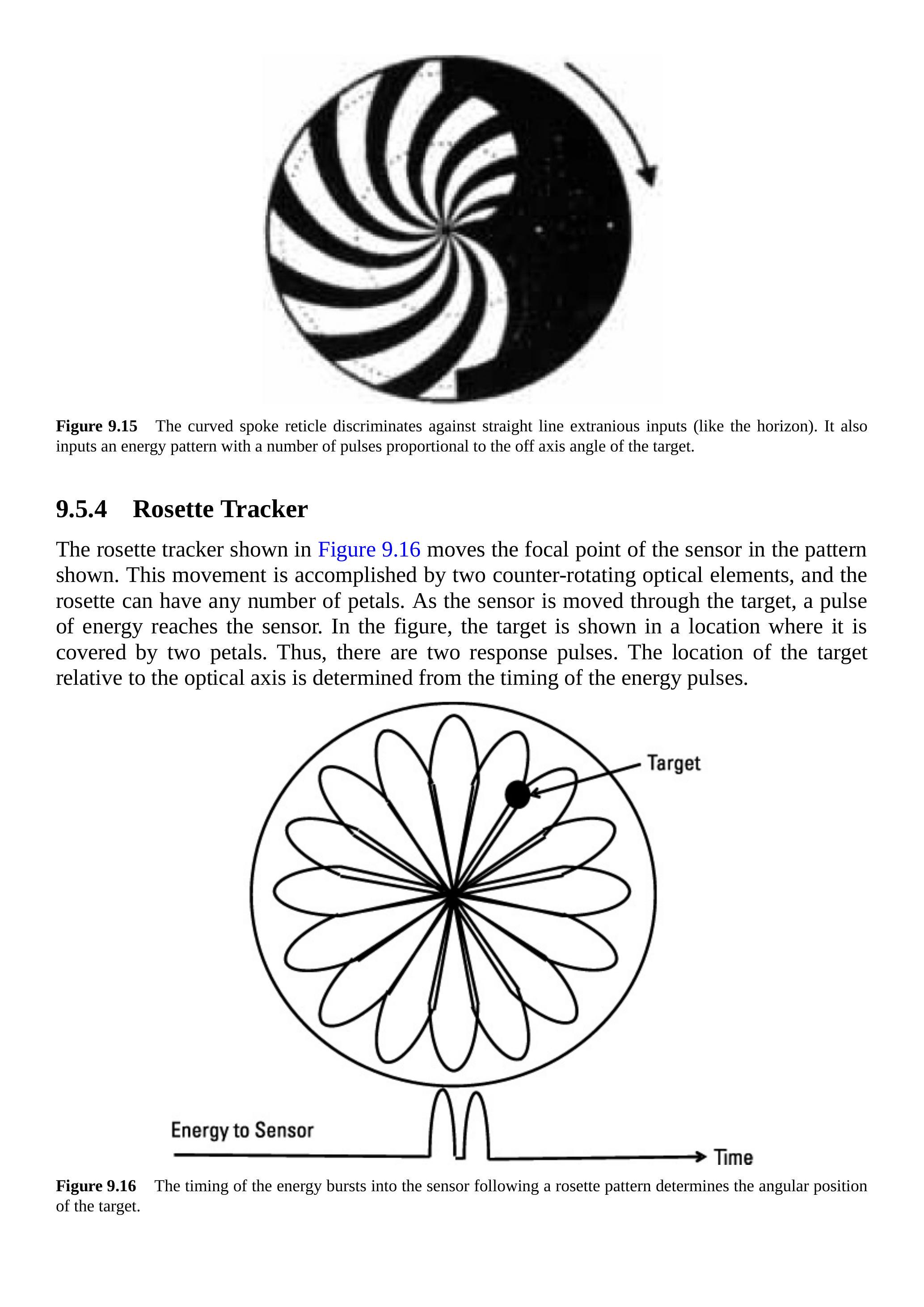如图 9.16 所示,玫瑰花跟踪器将传感器的焦点沿示意图所示模式移动。此运动通过两个反向旋转的光学元件实现,玫瑰花可以有任意数量的“花瓣”。当传感器经过目标时,一脉冲能量到达传感器。在图中,目标位于被两片花瓣覆盖的位置,因此产生两个响应脉冲。目标相对于光学轴的位置由能量脉冲的时间确定。