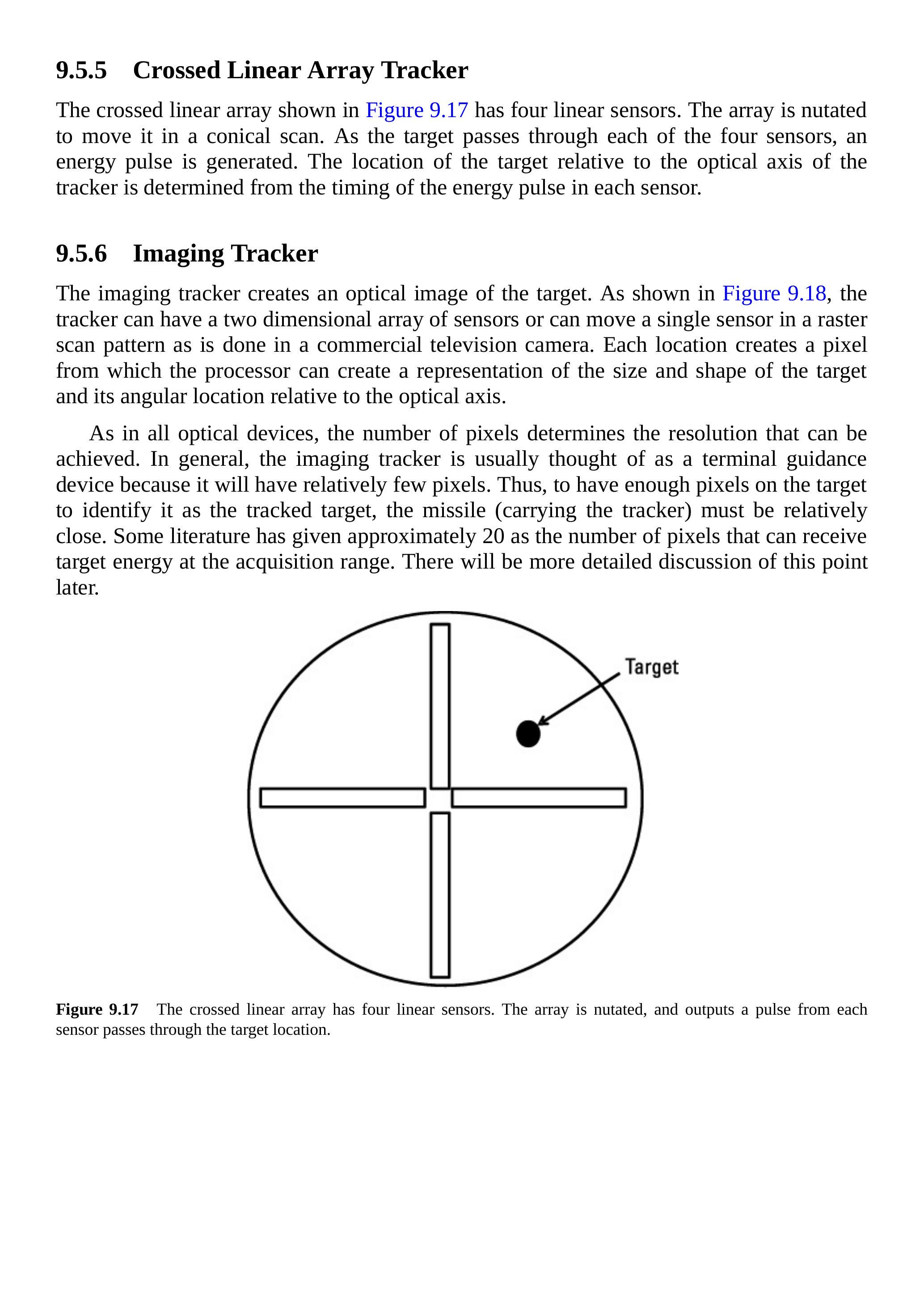 如图 9.17 所示,交叉线性阵列具有四个线性传感器。该阵列通过摆动(nutation)形成圆锥扫描。当目标经过四个传感器中的每一个时,会产生一个能量脉冲。目标相对于跟踪器光学轴的位置由每个传感器中能量脉冲的时序确定。