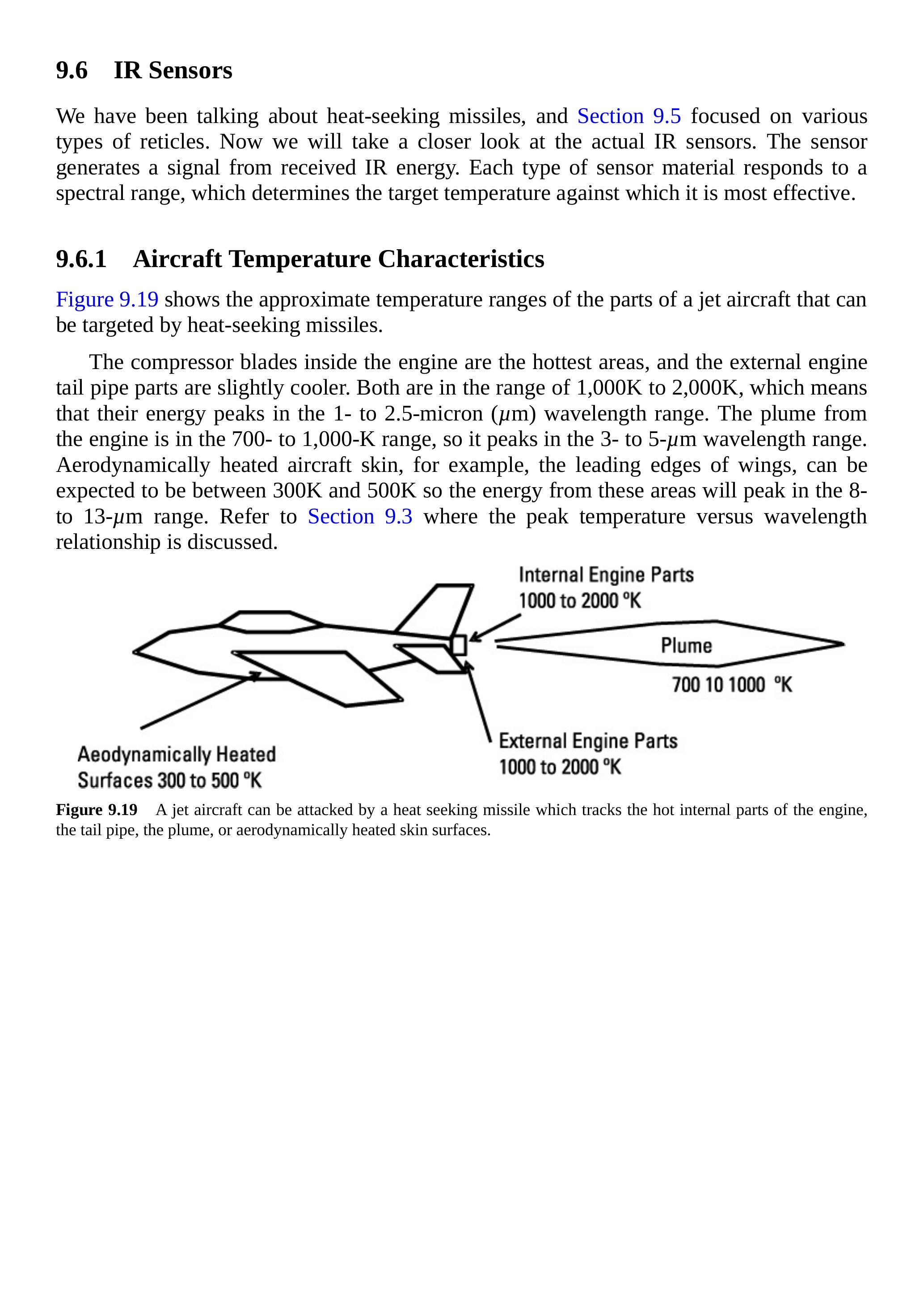 图 9.19 显示了喷气式飞机中可被热追踪导弹瞄准的部件的近似温度范围。