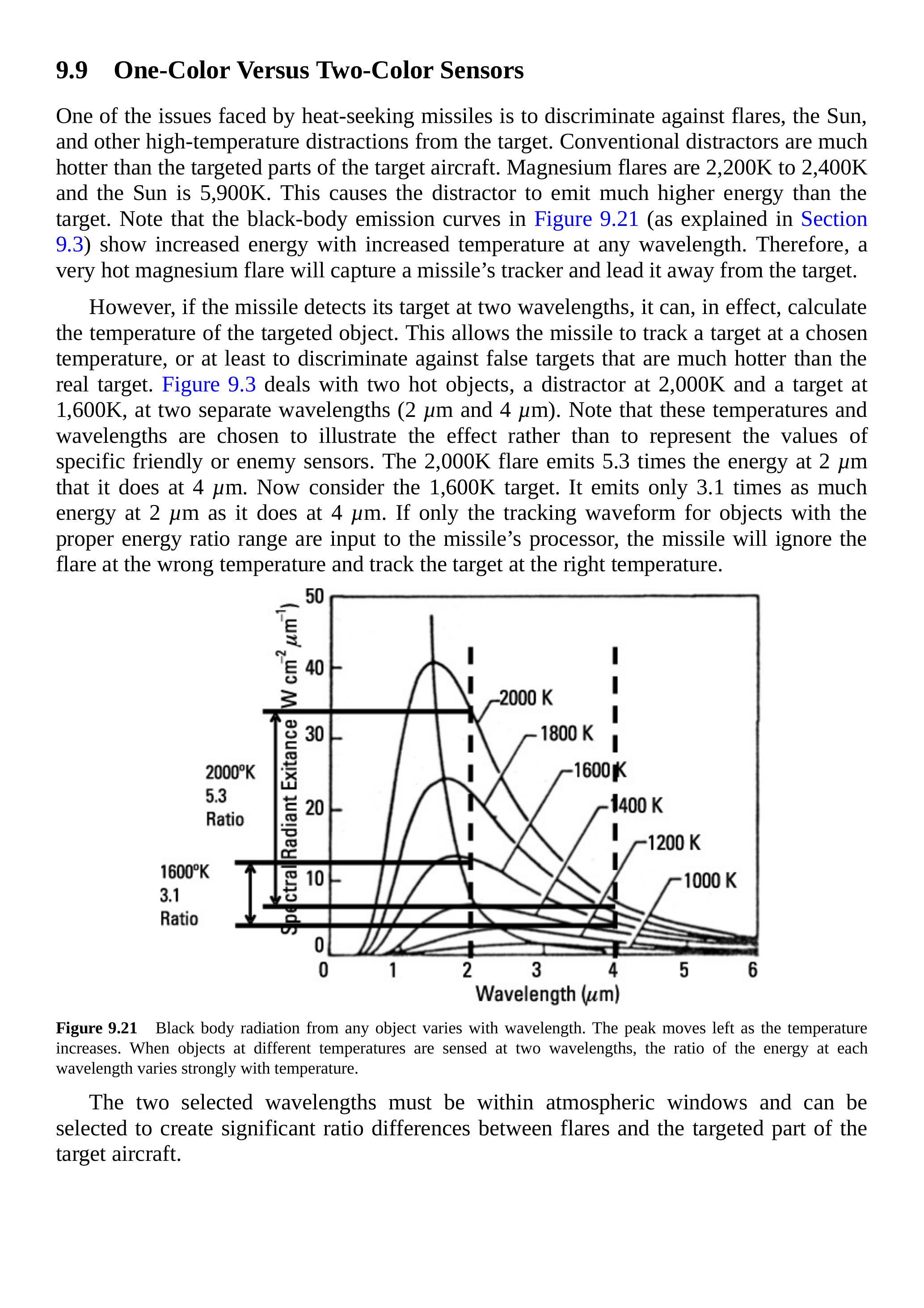 热追踪导弹面临的一个问题是如何区分诱饵、太阳以及其他高温干扰源与目标。常规干扰源比目标飞机的被瞄准部件温度高得多。镁质燃烧弹的温度为 \(2,200 \mathrm{~K}\) 到 \(2,400 \mathrm{~K}\),而太阳温度为 \(5,900 \mathrm{~K}\)。这导致干扰源发出的能量远高于目标。注意,图 9.21 中的黑体辐射曲线(如 9.3 节所述)显示,在任意波长下,温度升高会导致能量增加。因此,非常高温的镁燃烧弹会吸引导弹的跟踪器,使其偏离真正目标。