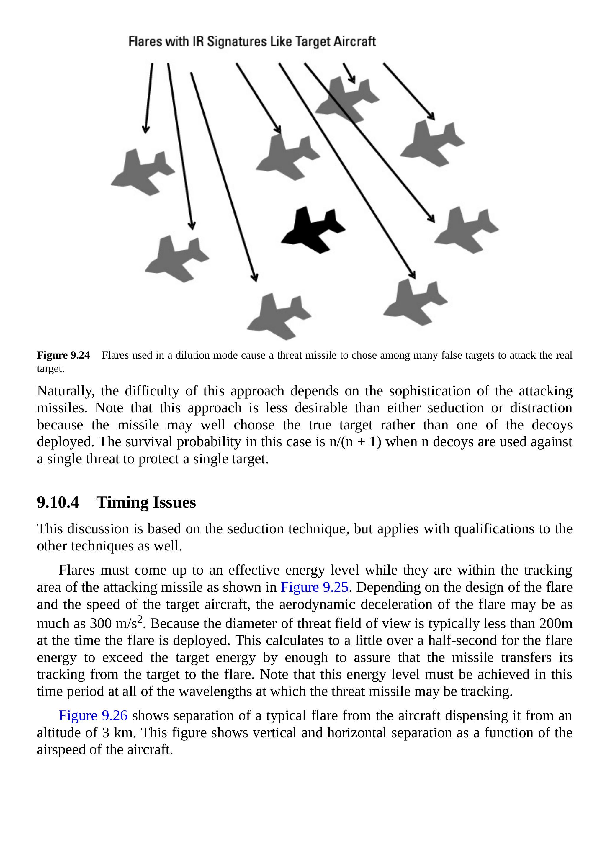 在干扰作用中,燃烧弹在热追踪导弹开始跟踪目标飞机之前投放,使导弹跟踪器先看到燃烧弹而非目标。在这种情况下,燃烧弹不需要产生比目标更大的信号,但需要足够接近,使导弹跟踪器将其视为有效目标。如果干扰成功,导弹将跟踪燃烧弹,而实际上永远看不到目标,如图 9.23 所示。注意,该技术也用于保护舰船免受热追踪反舰导弹攻击;然而,通常需要多个燃烧弹(或热诱饵)以最大化在导弹看到目标舰船之前捕获其跟踪器的概率。