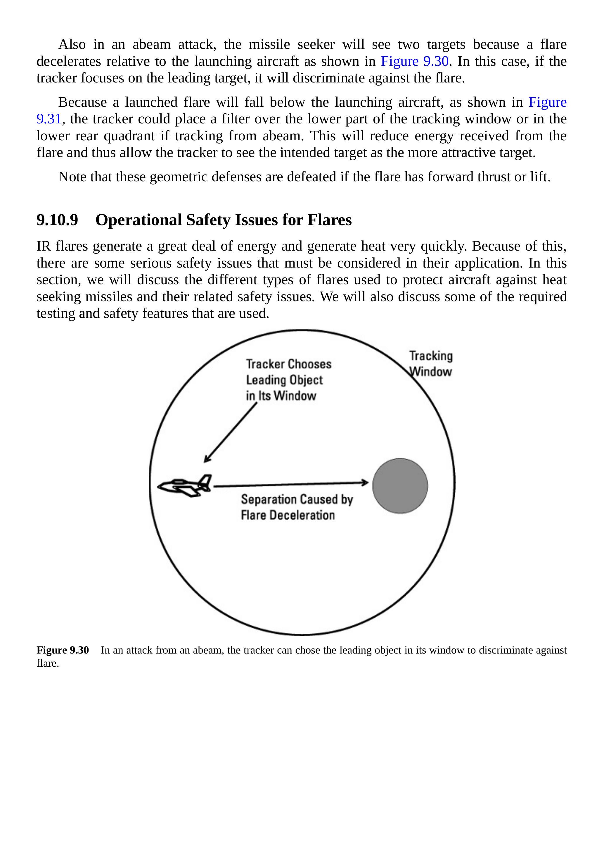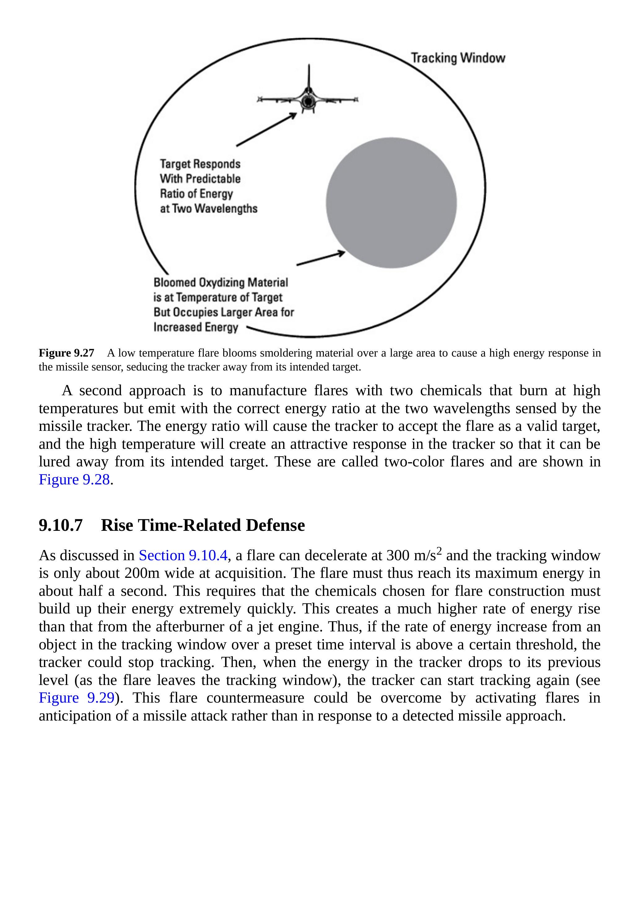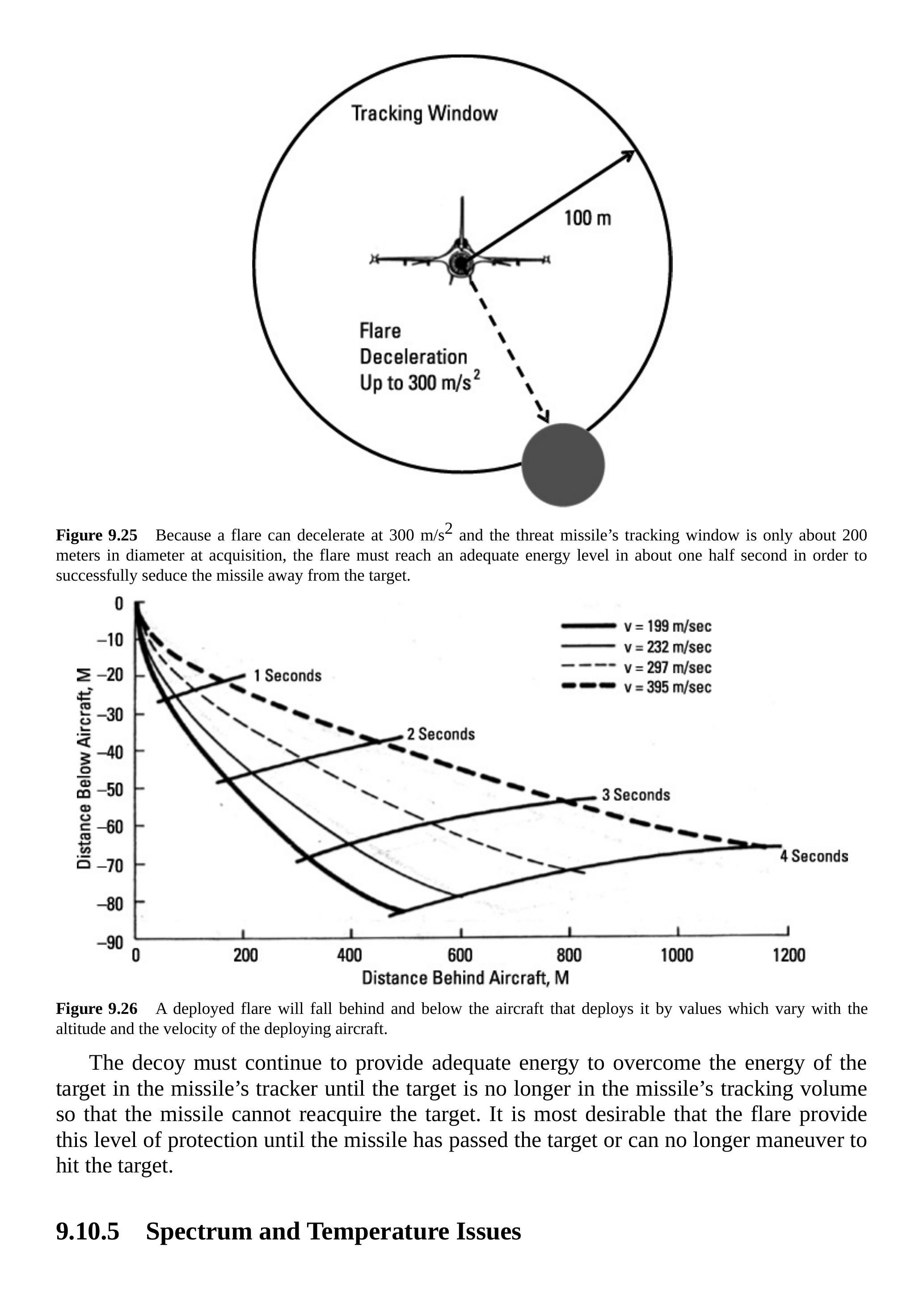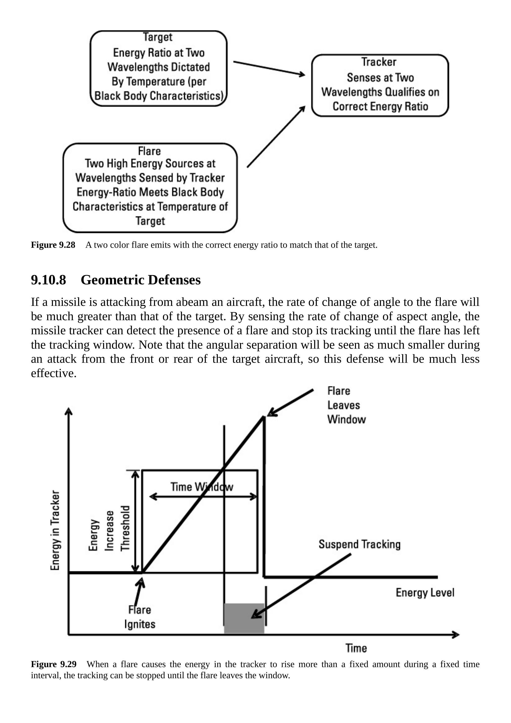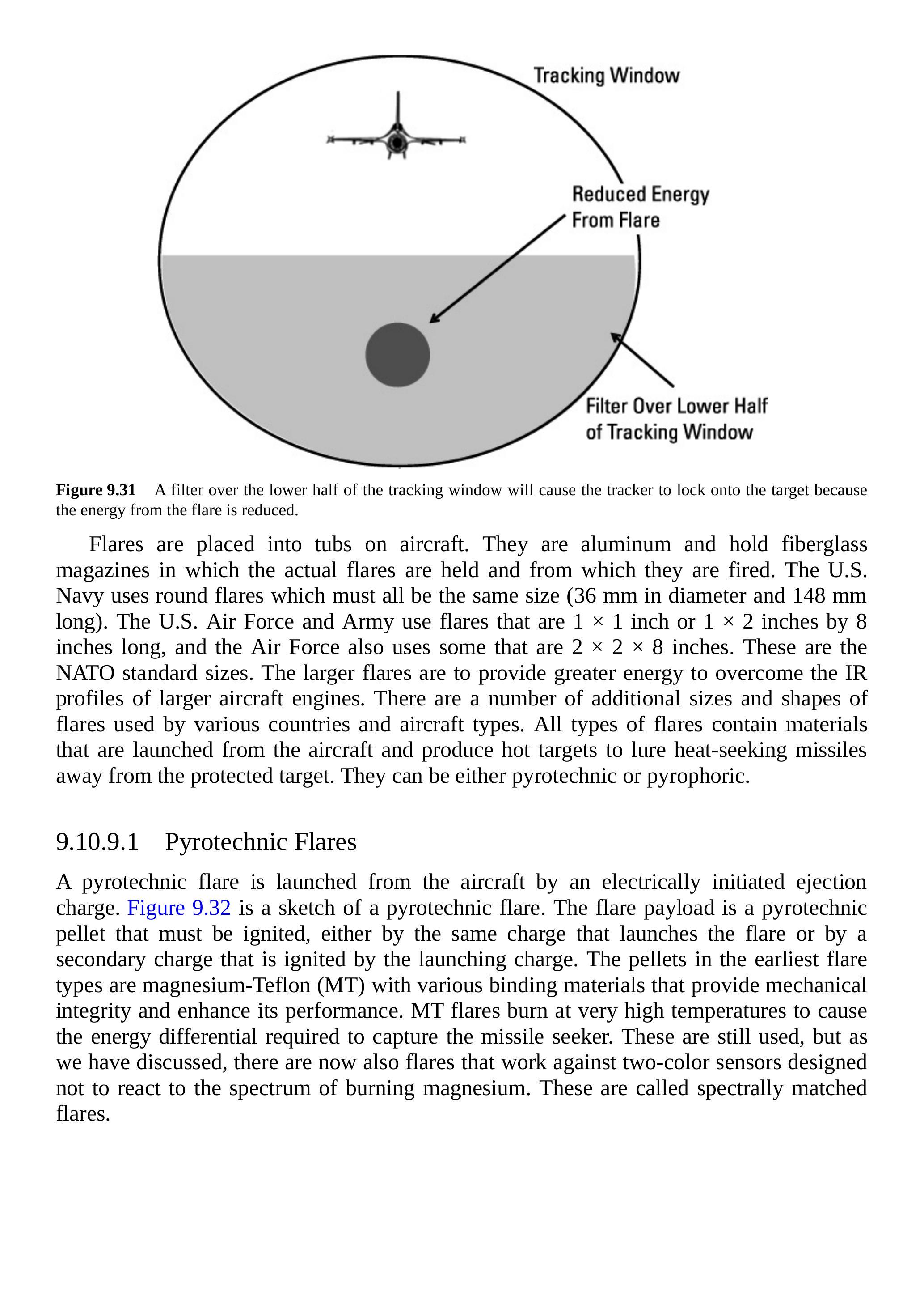 由于发射的燃烧弹会落到发射飞机下方,如图 9.31 所示,跟踪器可以在跟踪窗口的下半部分或从侧翼跟踪时的下后象限上放置滤光器。这将减少从燃烧弹接收到的能量,从而使跟踪器将预定目标视为更具吸引力的目标。
