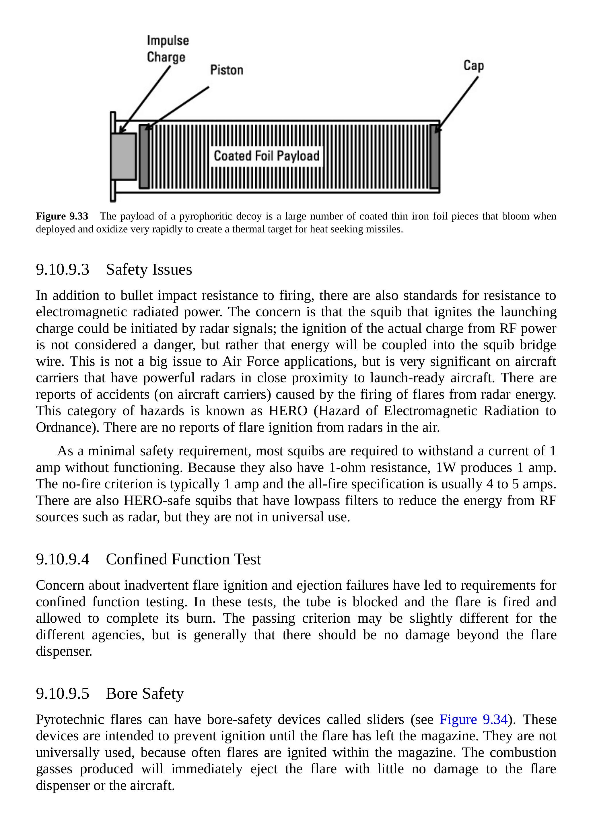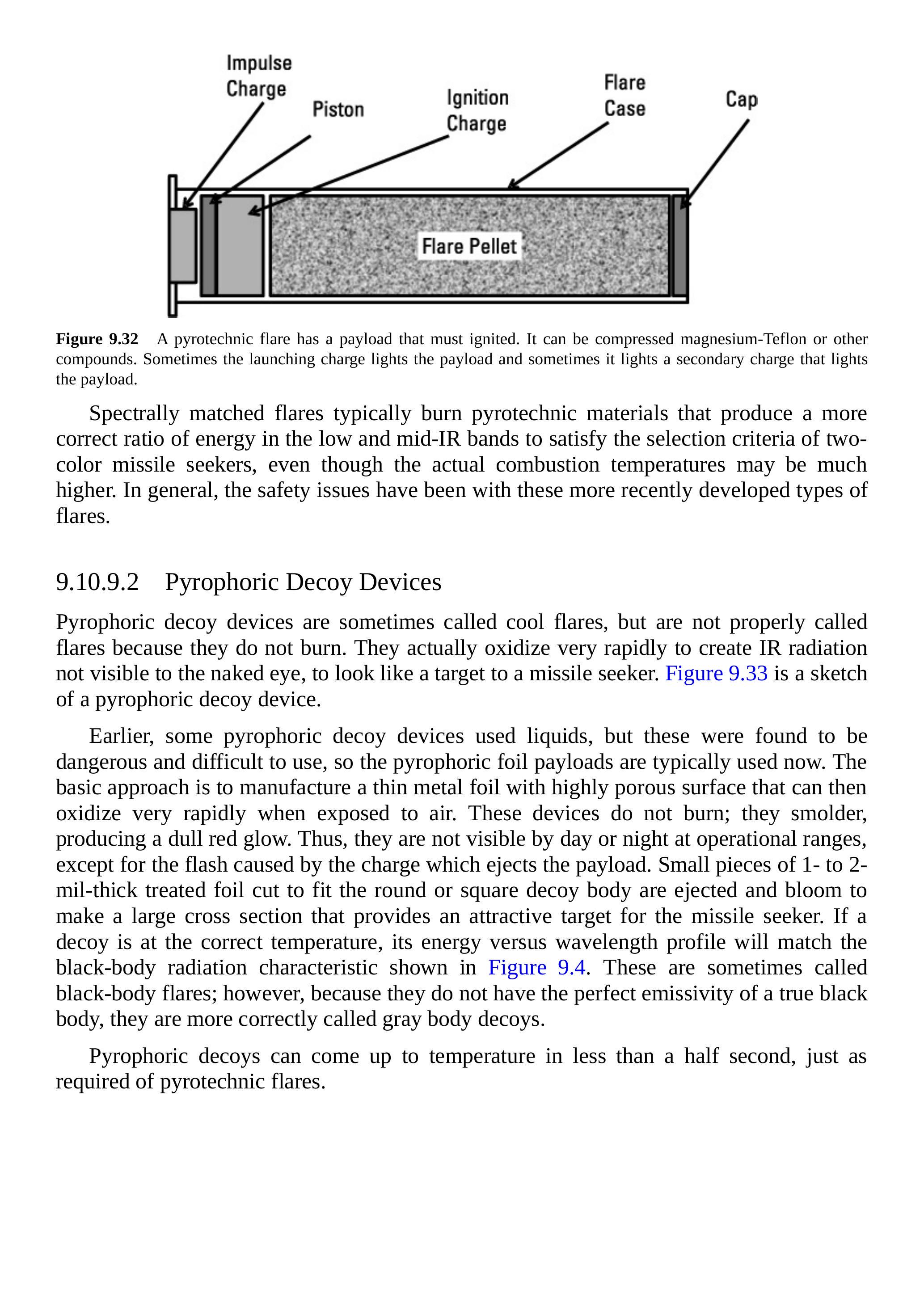 自燃型诱饵装置有时被称为“冷燃烧弹”,但严格来说不应称为燃烧弹,因为它们不燃烧。它们实际上通过快速氧化产生红外辐射(肉眼不可见),在导弹寻的器看来像目标。图 9.33 是自燃型诱饵装置的示意图。